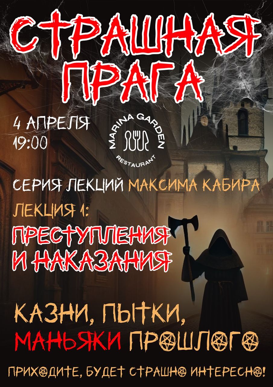 Историк и писатель Максим Кабир прочёт серию авторских лекций, посвящённых жестоким и жутким сторонам чешской истории. В первой лекции вы узнаете о казнях, судах, пытках и громких преступлениях от средневековья до Нового времени и совершите экскурсию по Праге 17 века. Как жили пражские палачи? Чем занималась инквизиция на территории Чехии? Кем были самые кровожадные маньяки прошлого? Будет страшно интересно.
