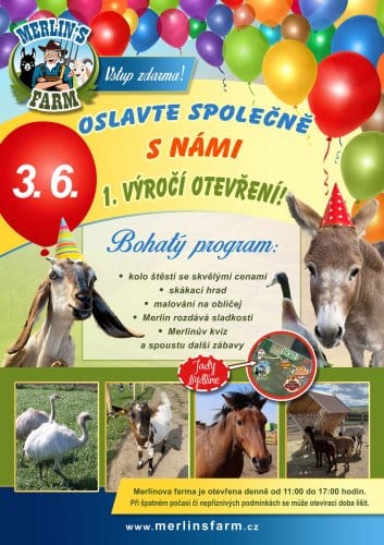 Merlinova farma je farmářská minizoo, kterou najdete za Merlinovým dětských světem v obchodně-zábavním areálu Excalibur City na hraničním přechodu Chvalovice-Hatě. První červnovou sobotu oslaví 1. rok své existence programem nejen pro rodiny s dětmi. Těšit se můžete – samozřejmě kromě mnoha zvířátek – také na „kolo štěstí“ se skvělými cenami, skákací hrad, malování na obličej, Merlinův kvíz ale i na Merlinovy sladkosti a spoustu další zábavy.