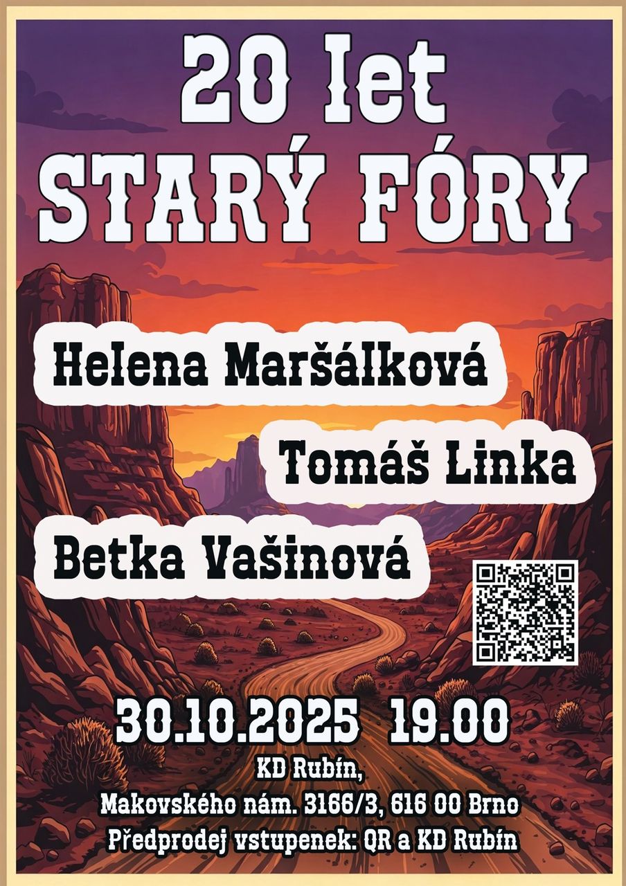 Zveme Vás na koncert 20 let Starý fóry s Tomášem Linkou, Helenou Maršálkovou a Betkou Vašinovou.