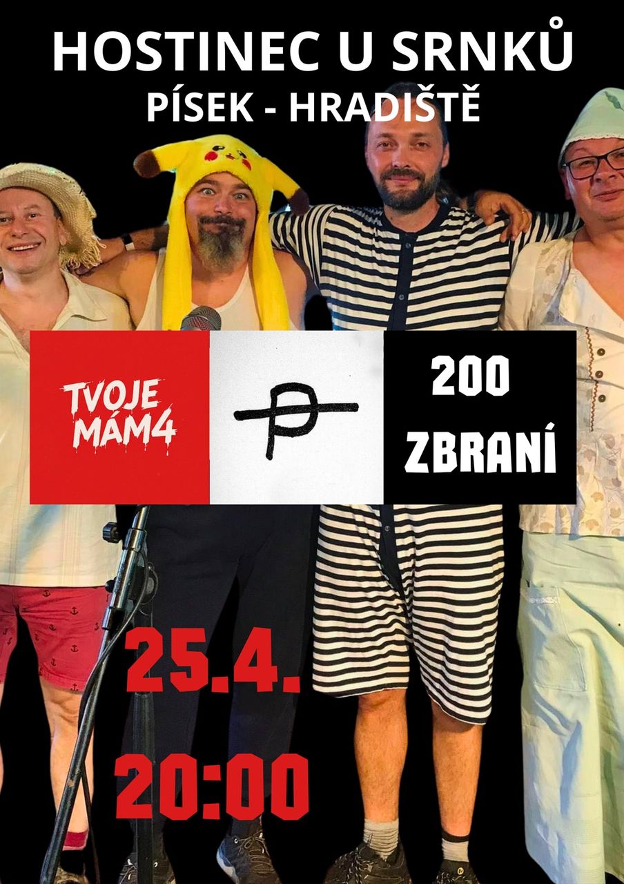 Zveme vás na jedinečný večer plný hudby! 25. dubna se v našem hostinci U Srnků představí kapely 200 zbraní, Tvoje máma a Permanent. Přijďte si užít skvělou atmosféru a podpořit mladé talenty! Kromě skvělé hudby se můžete těšit na vybrané speciality z naší kuchyně. Přijďte si užít večer plný chutí a skvělé atmosféry!
