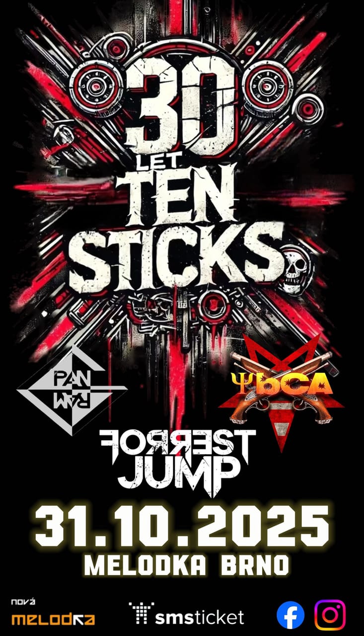 Crossover/nu-metalová kapela Ten Sticks z Brna letos slaví 30 let. Hostit tuto událost bude 31.10. 2025 brněnský klub Melodka. Jako hosté vstoupí kapely Pangram, Ybca nebo Forrest Jump. Kromě hostujících kapel se můžete těšit také na speciální playlist a bývalé členy Ten Sticks. Věříme, že společně s Vámi z této akce uděláme nezapomenutelný večer a všichni si koncert pořádně užijeme.