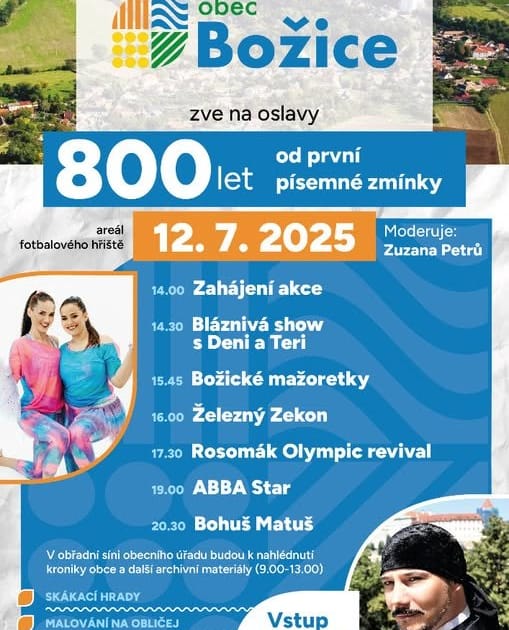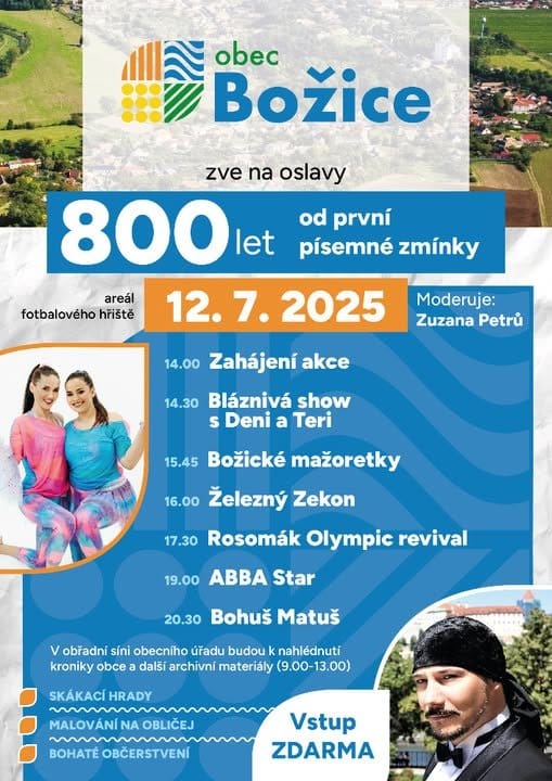 Obec Božice na Znojemsku slaví 800 let od svého založení a oslavy budou ve velkém stylu. Na účastníky čeká koncert BOHUŠE HANUŠE, bláznivá show s Deni a Teri, představit své silové dovednosti přijede ŽELEZNÝ ZEKON a další hudební i zábavní program. Pro děti budou připraveny skákací atrakce i malování na obličej. Oslavy se konají na fotbalovém hřišti od 14 hod. a celým programem bude provázet Zuzana Petrů. Během celé akce na Vás čeká i bohaté občerstvení. Pro zájemce bude také možnost nahlédnout do archivů a kronik obce na Obecním úřadě.