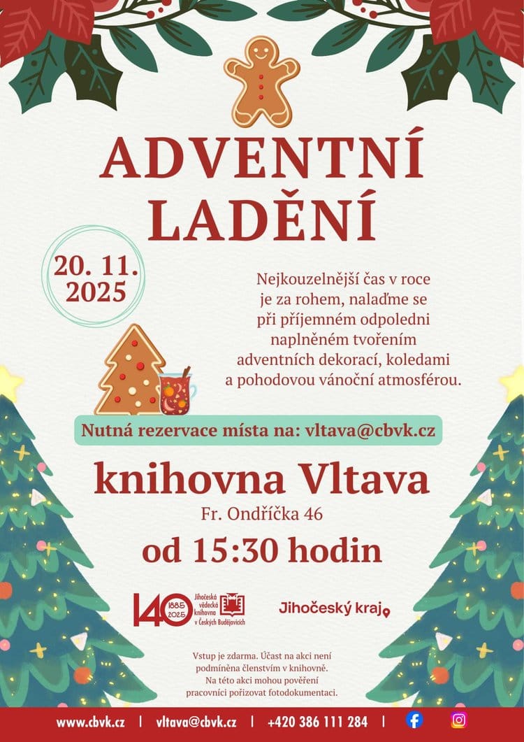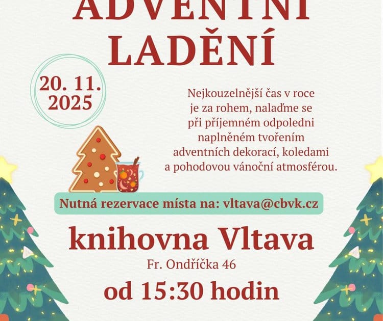 Nejkouzelnější čas v roce je za rohem, nalaďme se při příjemném odpoledni naplněném tvořením adventních dekorací, koledami a pohodovou vánoční atmosférou. Omezený počet míst. Nutná rezervace na vltava@cbvk.cz