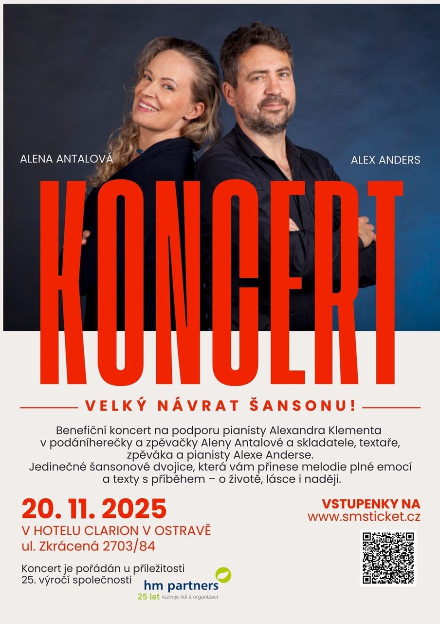 Nejen milovníci šansonu, ale i příznivci opravdové a upřímné muziky si přijdou na své v ve čtvrtek 20. 11. 2025 od 18 hodin, kdy vás za srdce chytnou herečka a zpěvačka Alena Antalová a skladatel, textař, zpěvák a pianista Alex Anders.
