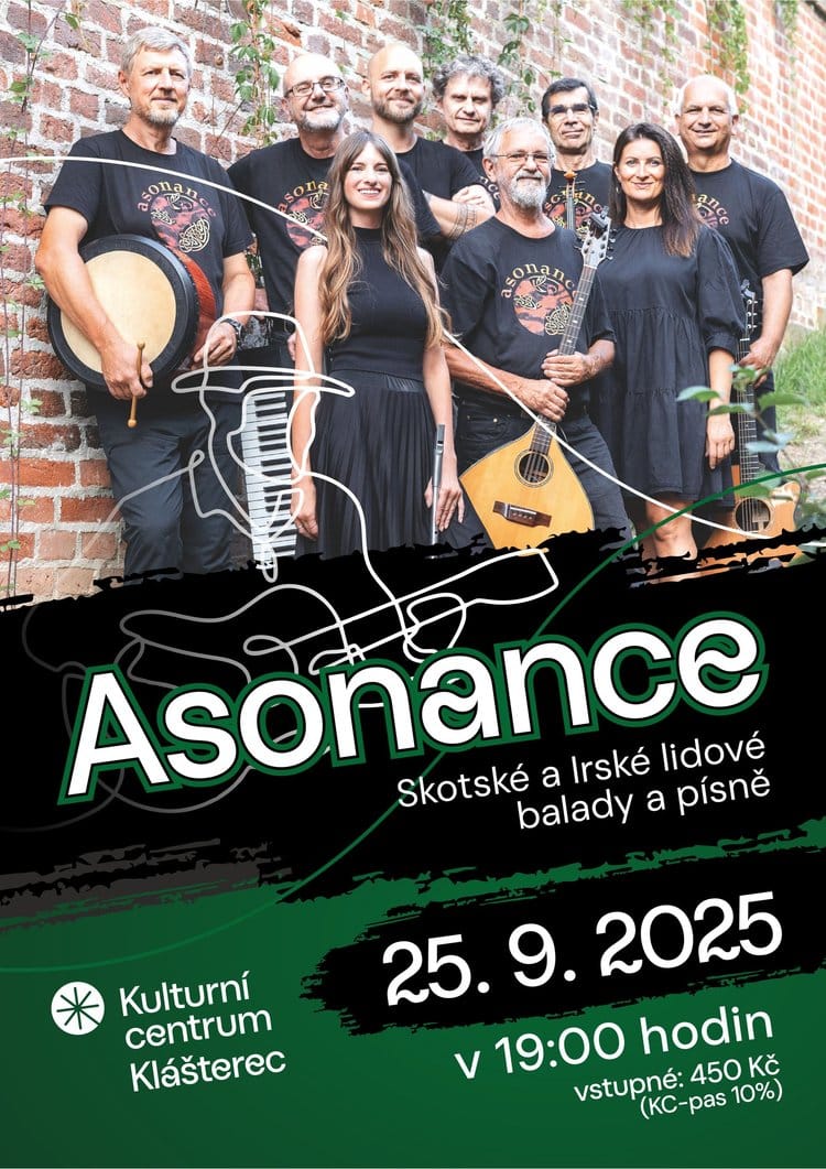 Nechte se unést kouzlem keltské hudby! Skupina Asonance patří mezi nejvýraznější interprety skotských a irských lidových balad u nás. Přijďte si užít večer plný krásných melodií, emocí a energie, která vás přenese na zelené ostrovy.
