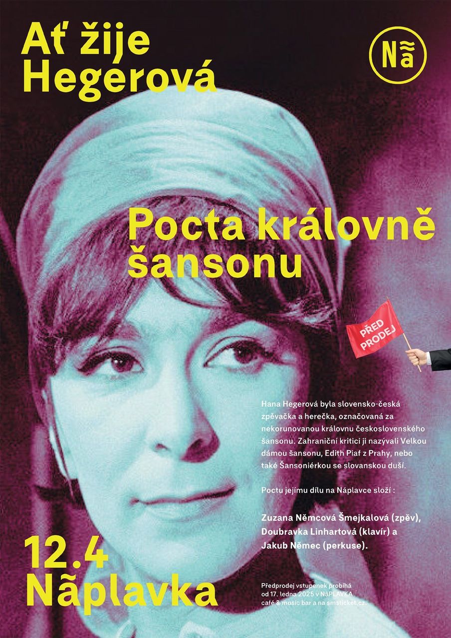 Hana Hegerová byla slovensko-česká zpěvačka a herečka, označovaná za nekorunovanou královnu československého šansonu. Zahraniční kritici ji nazývali Velkou dámou šansonu, Edith Piaf z Prahy, nebo také Šansoniérkou se slovanskou duší. Poctu jejímu dílu na Náplavce složí Zuzana Němcová (zpěv) Šmejkalová, Doubravka Linhartová (klavír) a na perkuse Jakub Němec.