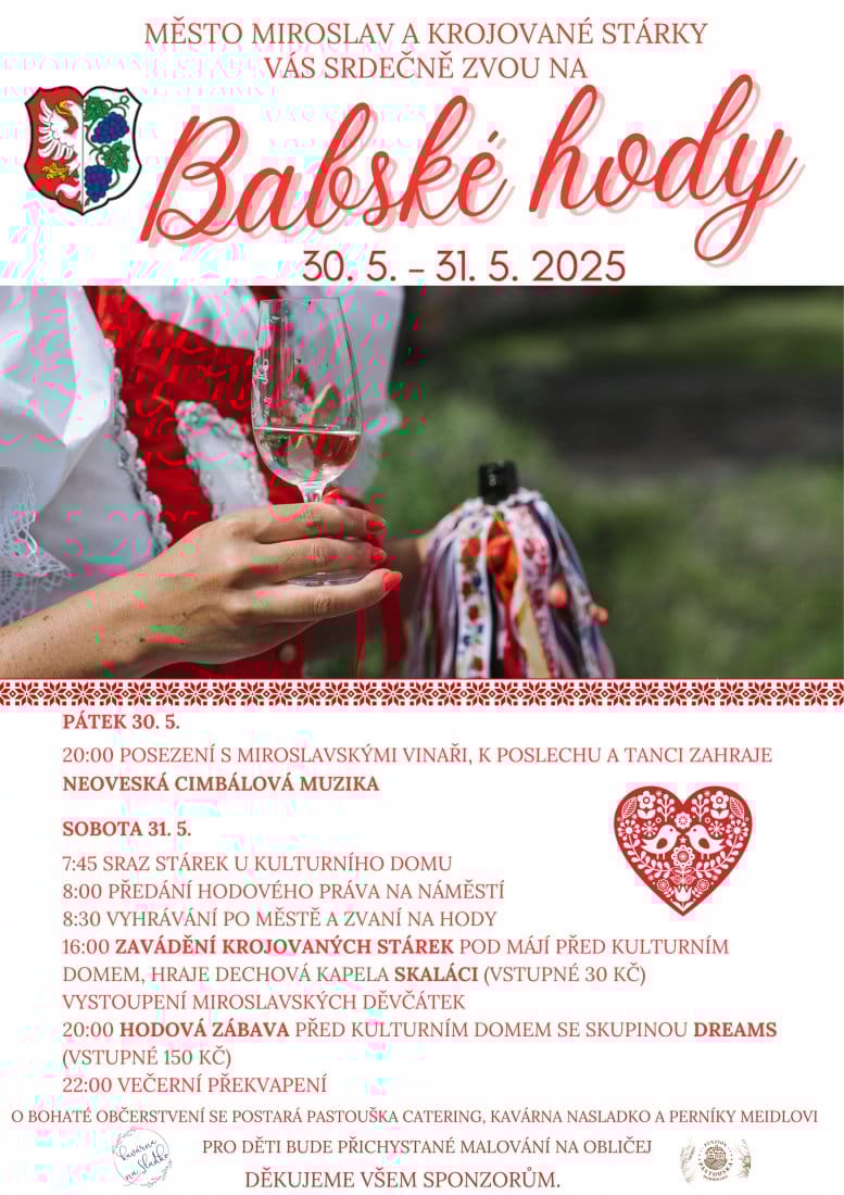 Město Miroslav a krojované stárky srdečně zvou na své tradiční Babské hody. Program odstartuje už v pátek večerním posezením s miroslavskými vinaři a Neoveskou cimbálovou muzikou (od 20 hod.). Sobotní program začíná již v 8 hod. ráno předáním hodového práva na náměstí a od 8:30 hod. začnou po městě zvát krojované ženy a dívky na hody za hudebního doprovodu. V 16 hod. se těšte na slavnostní Zaváděn krojovaných stárek pod májí před kulturním domem, kde bude hrát dechová hudba Skaláci a vystoupí miroslavská děvčátka. Ve 20 hod. začne hodová zábava se skupinou Dreams, kterou ve 22 hod. završí večerní překvapení. Na programu nebude chybět ani ochutnávka vín miroslavských vinařů a pro děti bude nachystáno malování na obličej.