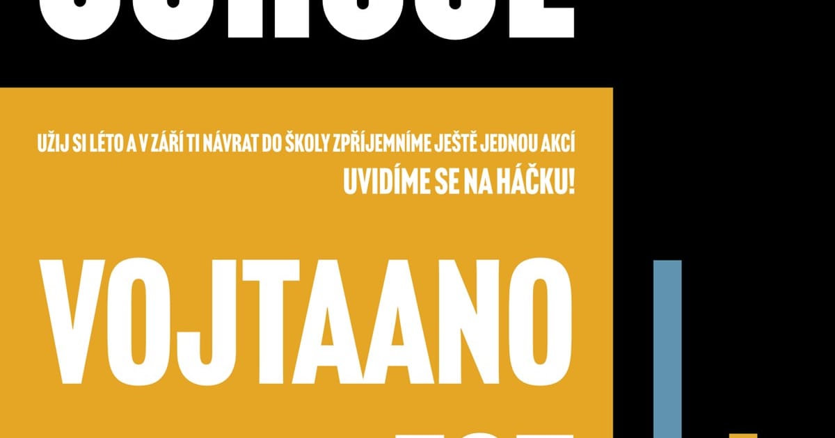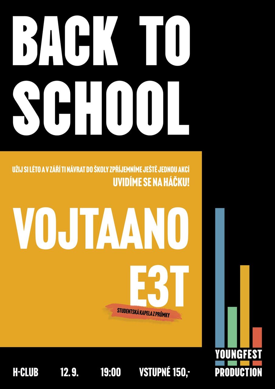 Školní rok je u konce a s ním začínají zasloužené prázdniny. Návrat v září do škol ale nemusí být jen nuda a povinnosti. Hned 12. září totiž proběhne v šumperském Háčku akce BACK TO SCHOOL pro všechny středoškoláky, studenty, ale i všechny milovníky dobré muziky. A to navíc s kvalitní hudbou v zádech. Na Back to school vystoupí legendární zpěvák Vojtaano a studentská skupina E3T z šumperské průmyslovky. Zahajme nový školní rok společně, uvidíme se na Háčku!