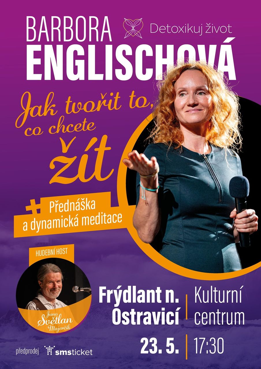 Autorka knižního bestselleru Detoxikuj život, certifikovaná koučka a psychoterapeutka NLP Bára Englischová zavítá se svou Detoxikuj tour 2025 jen do pěti pečlivě vybraných měst v ČR a na Slovensku. Jedním z těchto měst je i Frýdlant nad Ostravicí. V novém komponovaném programu s názvem „Jak tvořit to, co chcete žít“ nabídne poutavou přednášku a besedu věnovanou tématu tvoření reality tak, aby si každý host po setkání s ní, mohl hned vyzkoušet praktické metody tvorby reality podle svých představ. Těšit se můžete také na dynamickou meditaci na otevírání srdeční čakry, a jako vždy také intuitivní interakci s publikem. O hudební doprovod se postará fantastický Jano Svetlan Majerčík, který hraje v léčivé frekvenci 432 MHz.