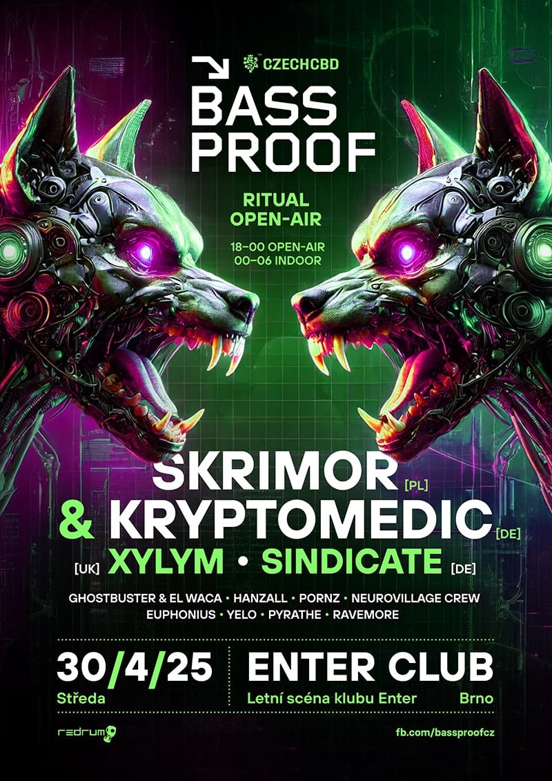 Bassproof open air startuje od 18:00 h a končí 00:00 h, následná párty bude pokračocat ve vnitřních prostorech klubu Enter – Brno, startuje od 00:05 h a pokročujeme až do raních hodin, konec je 06:00 h.