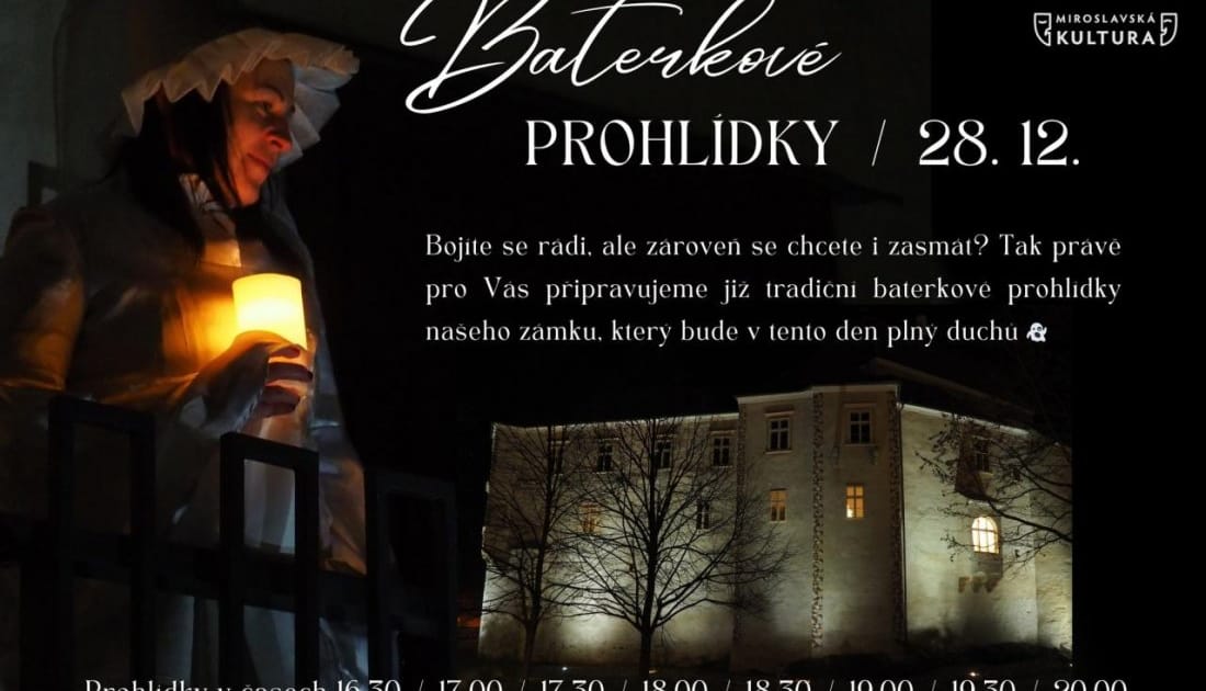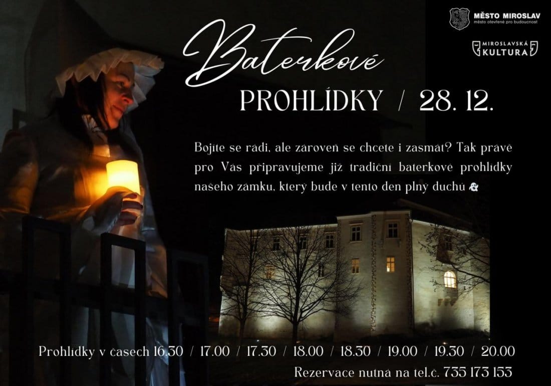 Speciální večerní prohlídky Miroslavského zámku za svitu svíček a baterek nabídne opět poslední sobota kalendářního roku. Dobrodružné prohlídky setmělého zámku proběhnou v pravidelných půlhodinových intervalech: první odstartuje v 16:30 a poslední ve 20:00 hod. Oživí je strašidla a duchové – téma letošního ročníku zní „Posmrtný život na zámku“. Nutná je ale vlastní baterka s sebou a předchozí rezervace na tel. č.: 735 173 153!