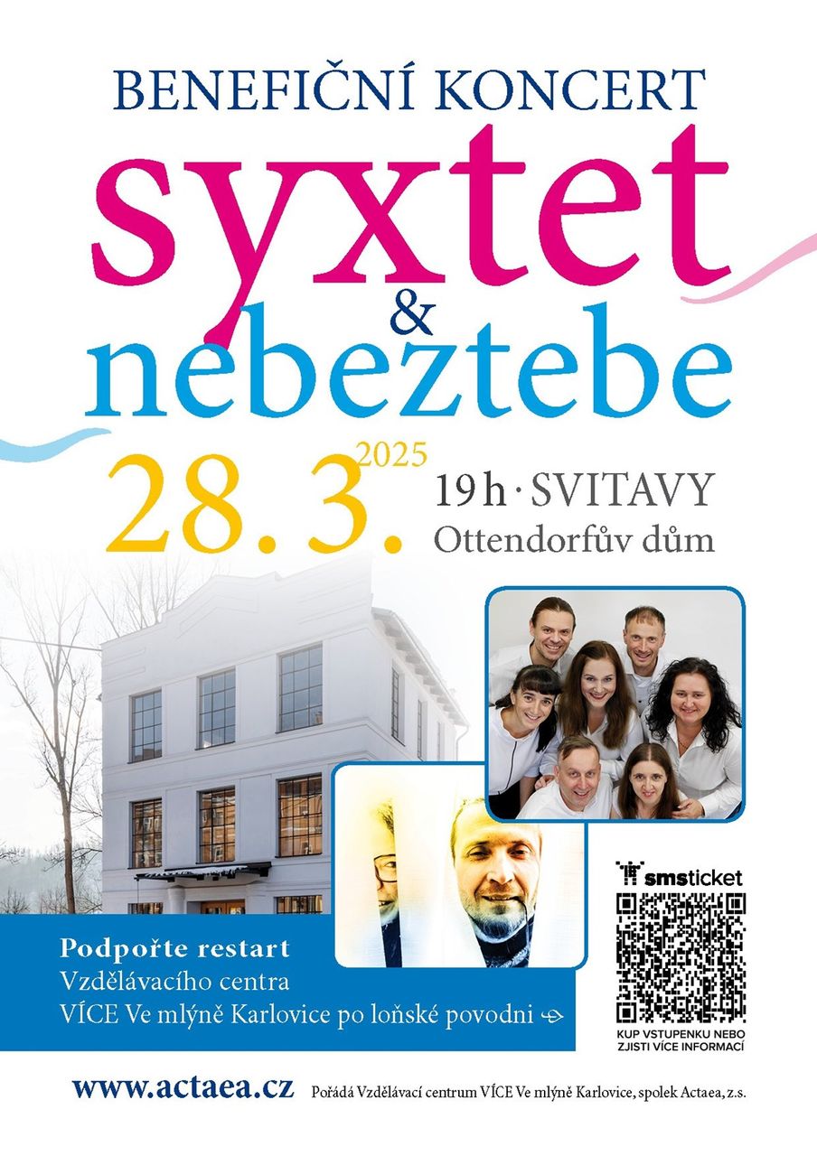 A proč koncert pořádáme ve Svitavách? Vzdělávací centrum vybudovala a vede svitavská rodačka Kateřina Kočí, rozená Ehrenbergerová. Proto se obracíme na vás, Svitaváky. Pojďte se s námi potkat, poslechnout si svitavský Syxtet a brněnskou kapelu Nebeztebe, a pak si třeba ještě zazpívat a posedět u kytary.
