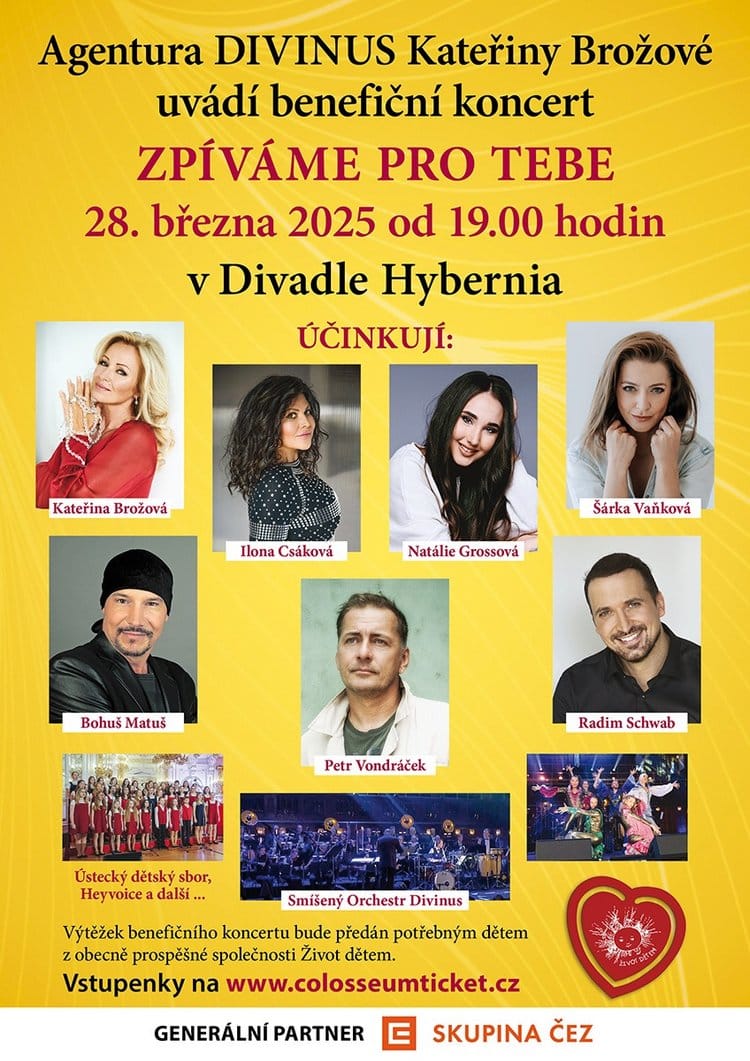 Benefiční koncert „Zpíváme pro Tebe“ se bude konat 28. března 2025 od 19:00. Výtěžek této velkolepé akce v produkci Agentury DIVINUS Kateřiny Brožové bude předán na jevišti divadla potřebným dětem z obecně prospěšné společnosti „Život dětem“. Zpívat Vám budou známé osobnosti: Kateřina Brožová, Ilona Csáková, Natálie Grossová, Radim Schwab, Petr Vondráček, Bohuš Matuš a další.