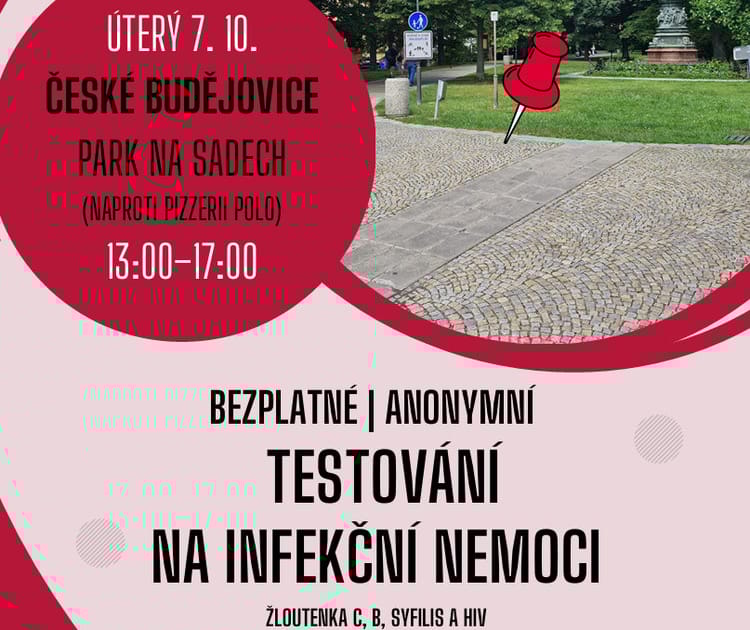 Testování na žloutenku typu B a C, HIV a syfilis proběhne v Českých Budějovicích v úterý 7. října od 13.00 do 17.00 v parku Na Sadech. Samotný test bude v odběrové sanitce provádět zdravotník z kapilární krve odebrané z prstu. Po vyšetření se každý otestovaný dozví svůj výsledek během několika minut. Zájemci se nemusejí předem objednávat.