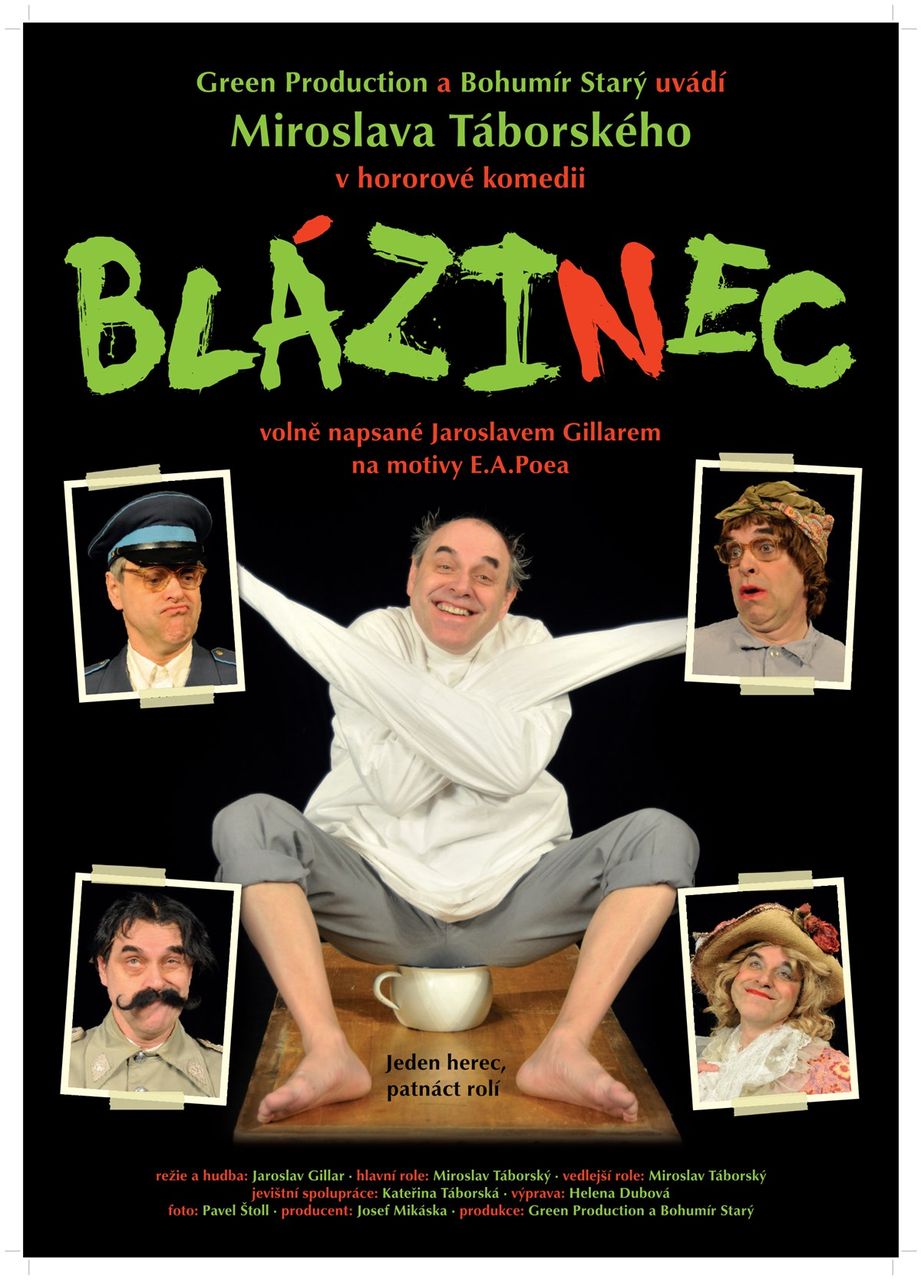 Hra BLÁZINEC Jaroslava Gillara je napínavou groteskou o světě, ve kterém se vlády zmocní blázni z jednoho psychiatrického ústavu. Téma ovládnutí společnosti šílencem je stále aktuální. Nečekané zvraty a konflikty jsou doprovázeny crazy sitruacemi jako z němého filmu. Výstupy často připomínají dramatiku absurdního divadla. Hra je inspirována mimo jiné motivy E.A.Poea, sugestivní scény strachu a hrůzy jsou protkány typickým Poeovským humorem a vytvářejí tak pro diváka velký jevištní zážitek.