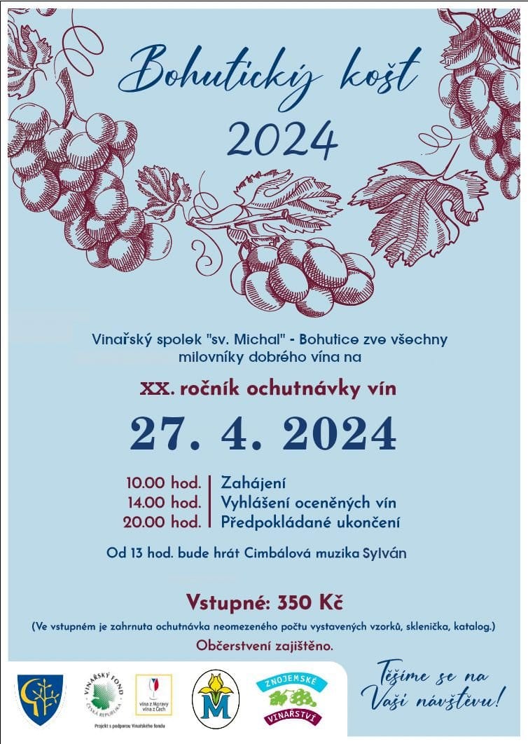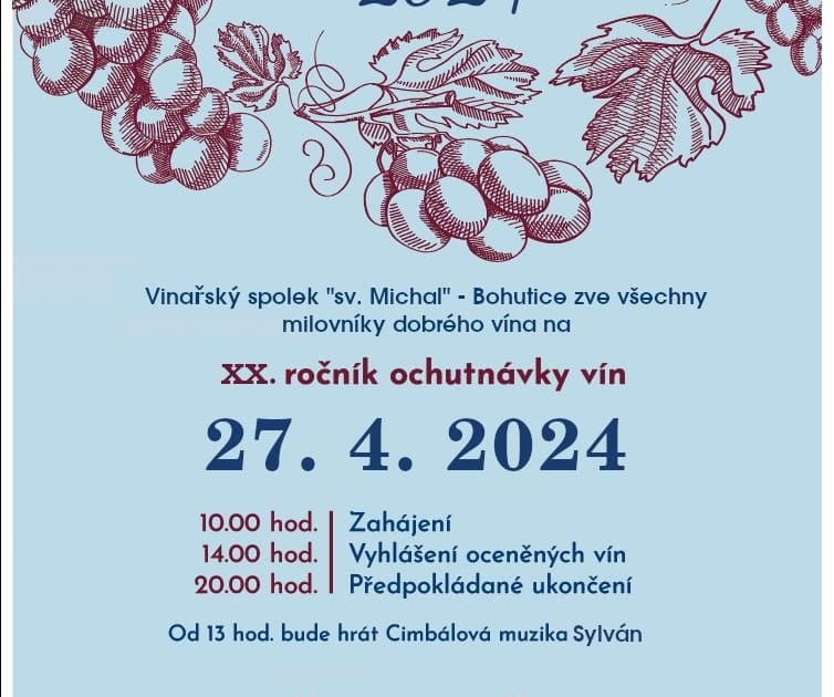 Vinařský spolek „Sv. Michal“ z Bohutic připravil v prostorách Bohutického zámečku už 20. ročník svého jarního Bohutického koštu regionálních vín. Začátek akce v 10 hod. a chybět tradičně nebude ani cimbálová muzika.