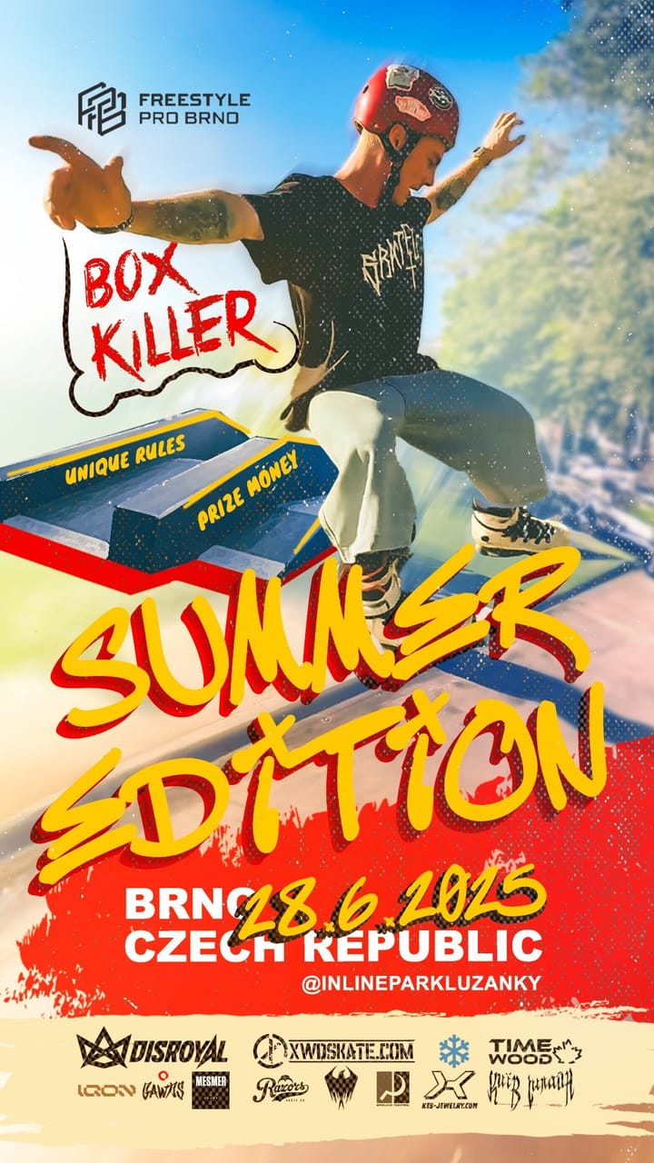 Boxkiller2025 is here and it’s going to be original…again! This time, you can look forward to a park edition at Inlinepark Lužánky. As usual, there will be prize money, loads of gear from sponsors, unique trophies crafted by an artistic blacksmith, and most importantly – a pub right next to the park. Don’t miss this one-of-a-kind competition featuring riders from nearly all around the world.