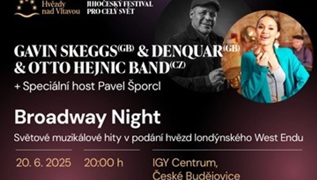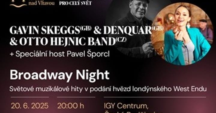 Zažijte nezapomenutelný OPEN AIR večer plný emocí, vášně a světových muzikálových hitů! Koncert ve stylu Broadway show vás zavede do kouzelného světa slavných melodií a duetů z ikonických muzikálů, které dobyly srdce diváků po celém světě. Nechte se unést vášní, emocemi a magií, které ožijí na speciálně postaveném pódiu v netradičním prostředí venkovního parkovišti obchodního centra IGY. To vše v podání hvězd West Endu Gavina Skeggse a Denquar, doprovázených výjimečnou Otto Hejnic Band. Jako speciální host vystoupí i Pavel Šporcl.