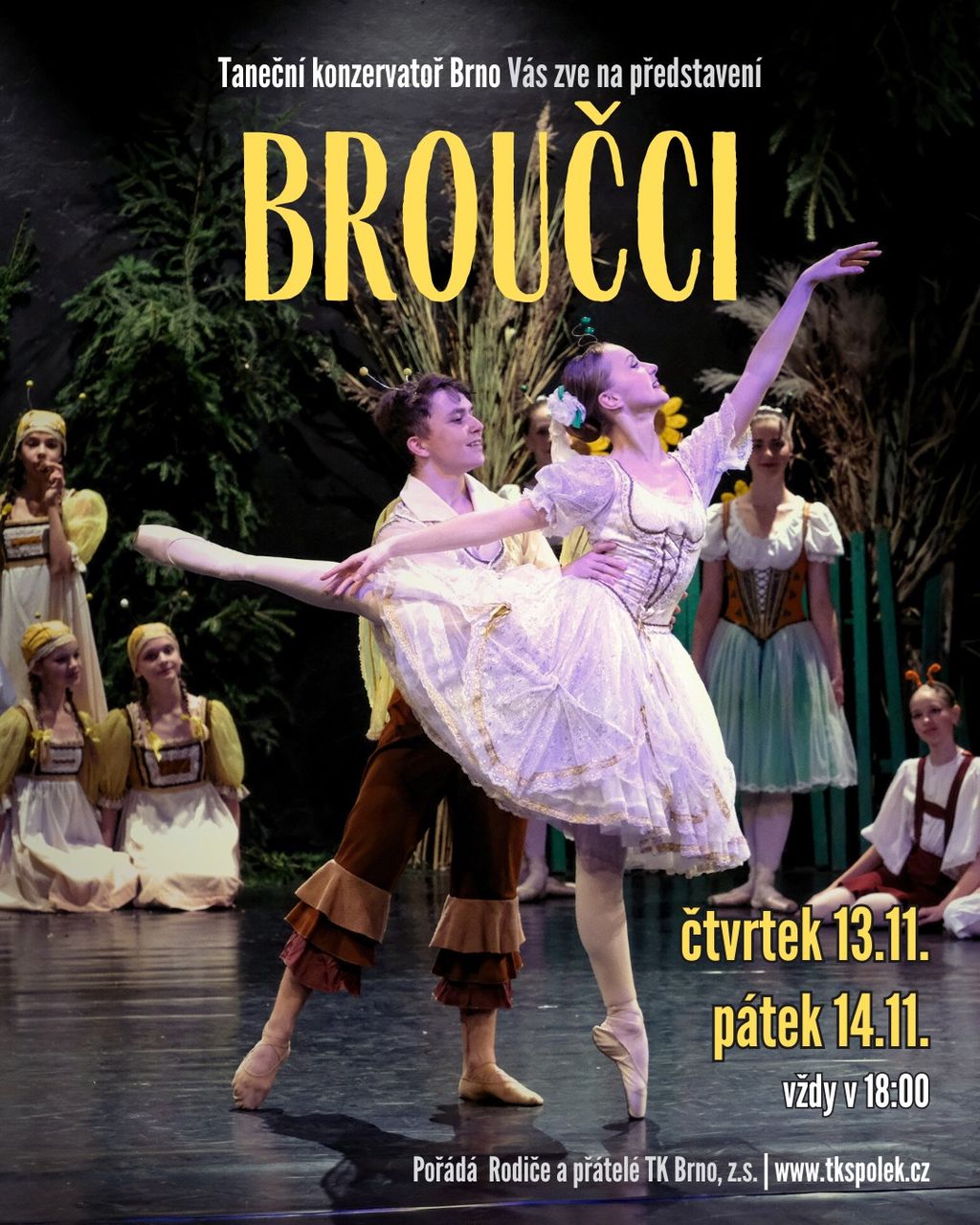 Barevné kostýmy, kouzelná hudba a poetický tanec vtáhnou malé i velké diváky do světa broučků a jejich přátel. Hodinové rodinné představení přinese radost, napětí i dojetí – ideální zážitek pro školy, rodiny i prarodiče s vnoučaty.