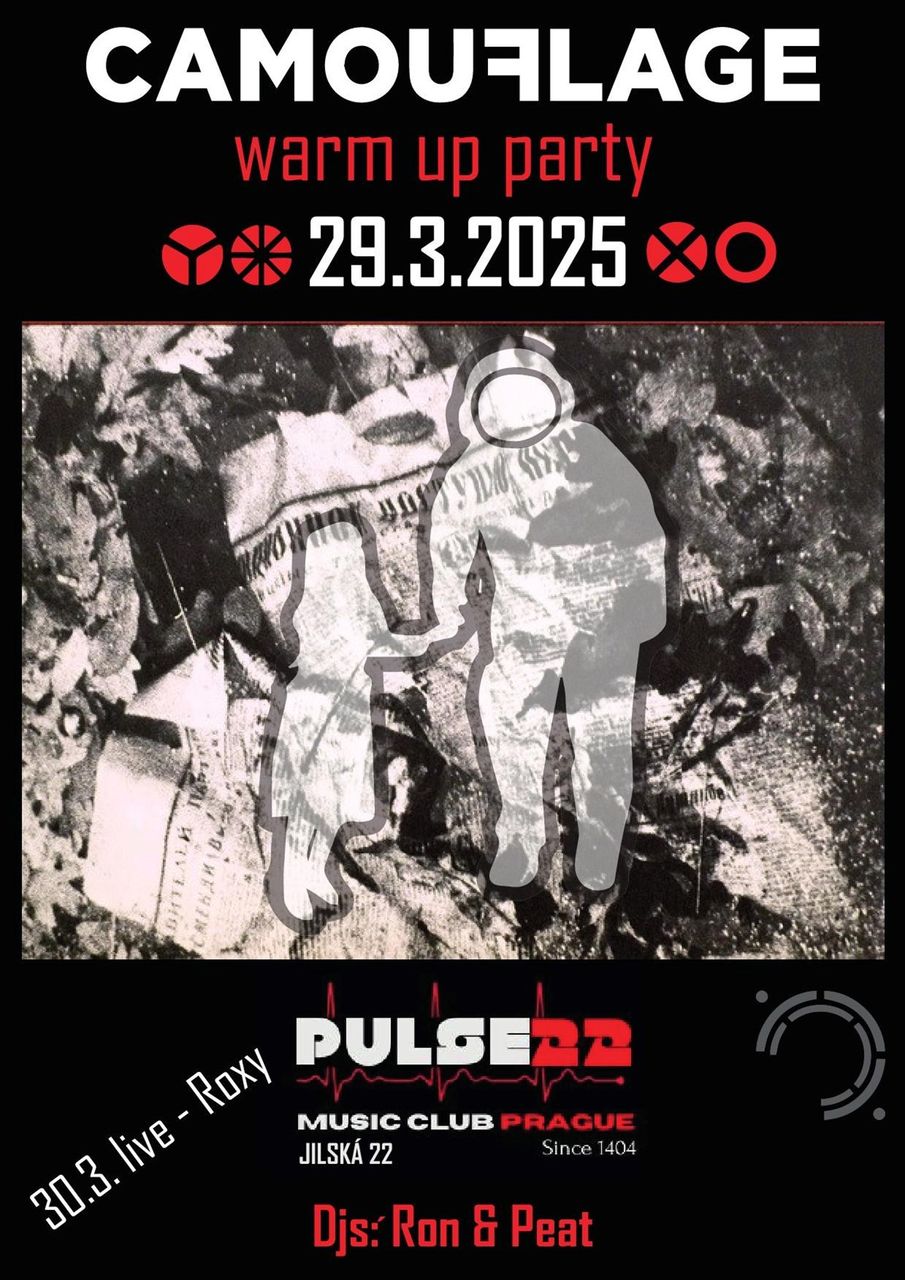 První párty věnová pouze kapele Camouflage, která si jistě takovou akci zaslouží. Pokud nemůžeš jet 29.3. do Bratislavy na jejich koncert, tak se přijď v sobotu naladit do klubu Pulse 22 v Jilský a v neděli pak do Roxy na jejich koncert.