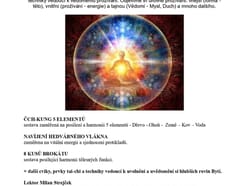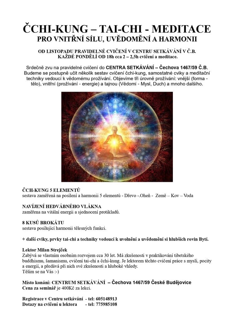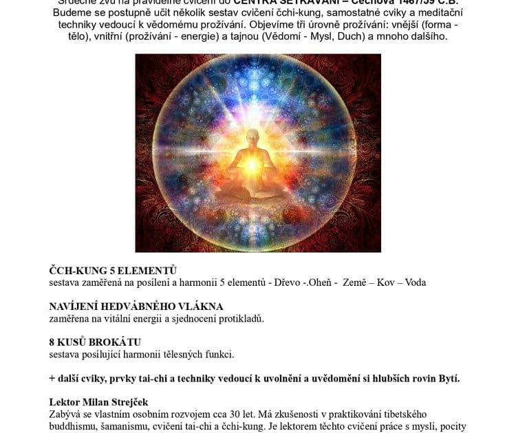 Každé pondělí od 18:00 hod. (2-2,5 hod.) na vás čekají pravidelná cvičení pro vnitřní sílu, uvědomění a harmonii. Učíme se několik sestav cvičení čchi-kung, samostatné cviky a meditační techniky, vedoucí k vědomému prožívání. Objevíme tři úrovně prožívání: vnější (forma-tělo), vnitřní (prožívání-energie) a tajnou (Vědomí-Mysl-Duch) a mnoho dalšího.