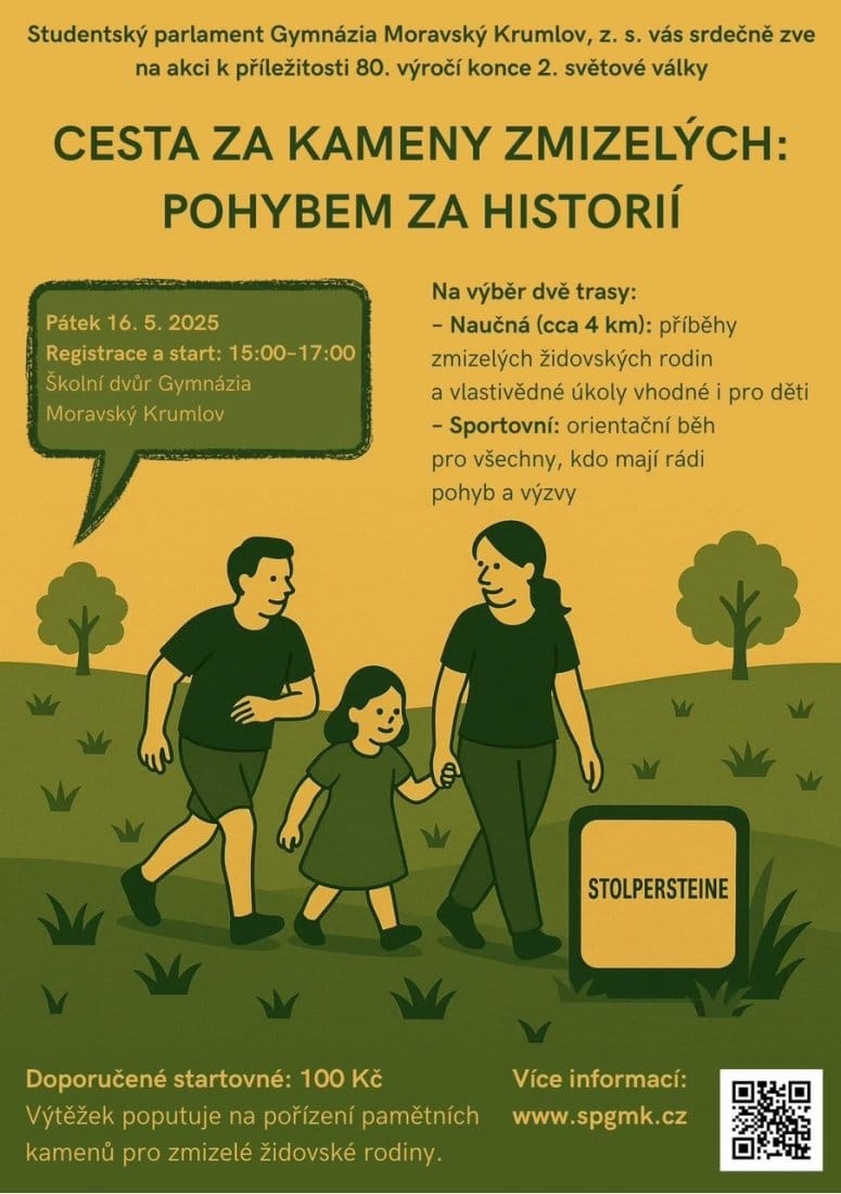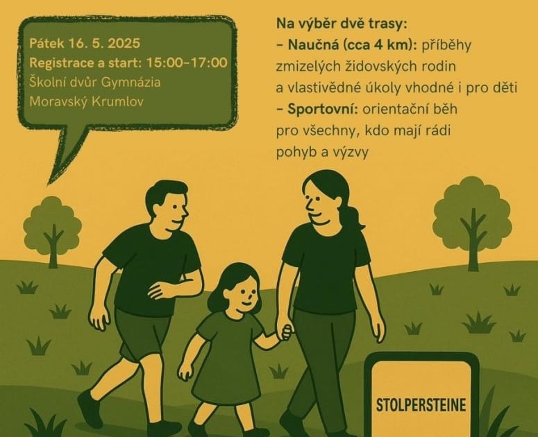 V pátek 16. května se v Moravském Krumlově uskuteční sportovně laděné odpoledne s cílem připomenout 80. výročí od ukončení 2. světové války a s ní spojené osudy místních židovských rodin, které zmizely během holokaustu. V rámci programu jsou připraveny dvě trasy s různou náročností – vycházková trasa vhodná pro rodiny s dětmi i seniory a druhá, náročnější, která je koncipována jako orientační běh. Pro účastníky jsou připraveny i vědomostní kvízy a hádanky. Cesta za kameny zmizelých je akcí, která spojuje pohyb i poznání naší historie. Začátek akce je plánován od 15. hodin a sraz je na školním dvoře místního gymnázia.