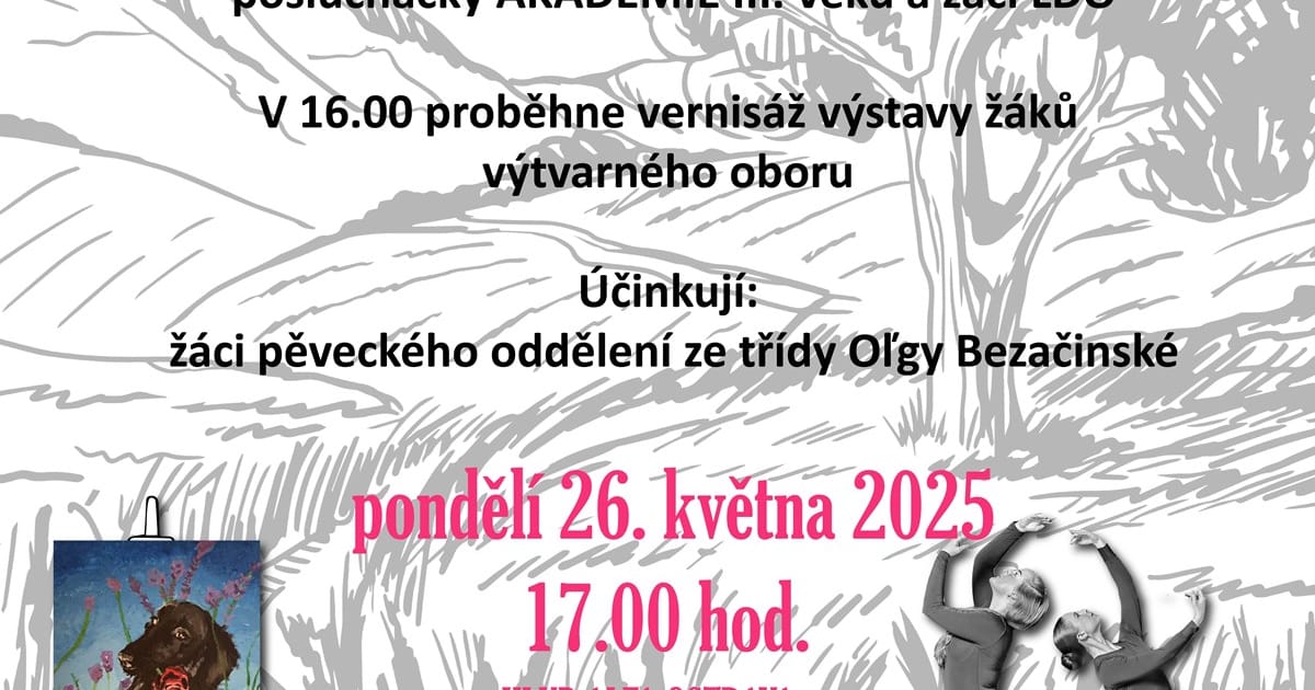 Milá rodino, přátelé a příznivci dětského světa umění, přijďte a prožijte s námi odpoledne plné radosti a úsměvů v krásných prostorách Klubu Alfa v Ostravě. Pro milovníky výtvarného umění, proběhne ve foyer vernisáž výtvarného oboru, kterou doprovodí žáci pěveckého oddělení naší školy.