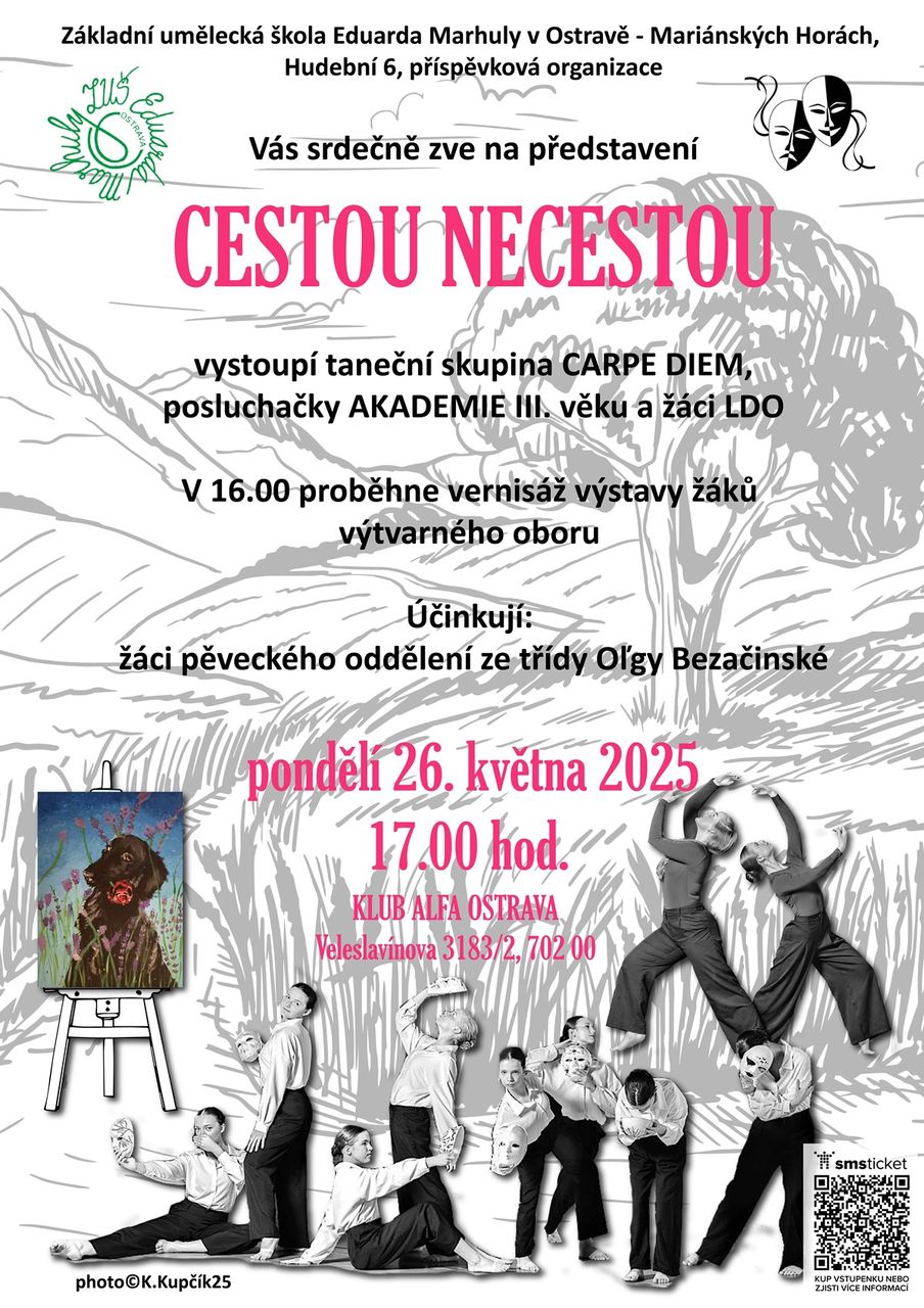 Máte rádi tanec, hudbu, zábavu? Tak právě pro vás si připravila taneční skupina Carpe Diem a žáci literárně dramatického oboru Základní umělecké školy Eduarda Marhuly v Ostravě – Mariánských Horách své ročníkové představení s názvem „CESTOU NECESTOU“