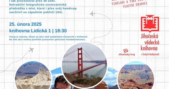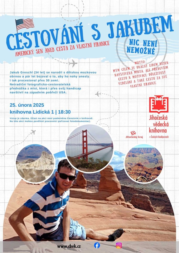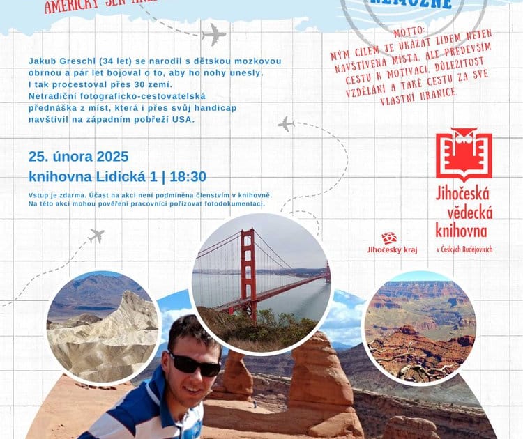 Jakub Greschl ( 34 let) se narodil s dětskou mozkovou obrnou. I tak ale procestoval přes 30 zemí. Netradiční fotograficko-cestovatelská přednáška z míst, která i přes svůj handicap navštívil na západním pobřeží USA. Motto: „Mým cílem je ukázat lidem nejen navštívená místa, ale především cestu k motivaci, důležitost vzdělání a také cestu za své vlastní hranice“.