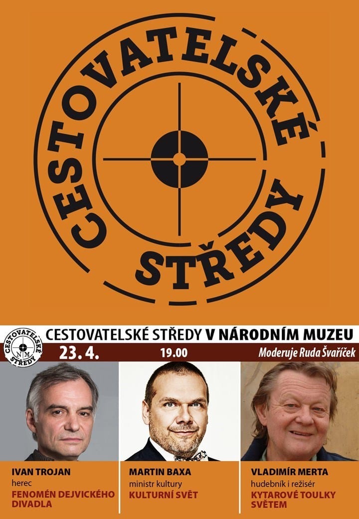 Příjemnou atmosféru jedinečného večera Cestovatelských střed v NM vytvoří herec Ivan Trojan, který přiblíží fenomén Dejvického divadla, s ministrem kultury Martinem Baxou nahlédneme do kulturního světa jeho očima a s hudebníkem Vladimírem Mertou se budeme toulat světem s kytarou.