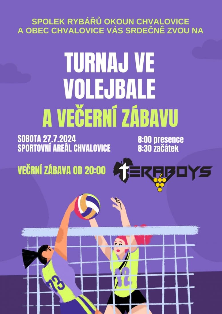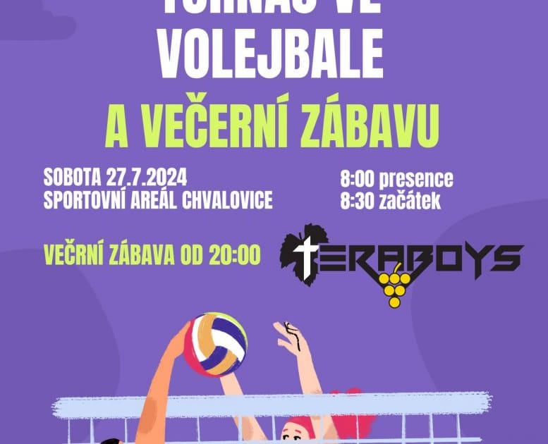 Sportovní výkony společně s hudbou a tancem si můžete vychutnat v sobotu 27. července ve sportovním areálu u fotbalového hřiště ve Chvalovicích. Volejbalový turnaj (už 19. ročník) zahájí v 8 hod. prezence týmů a od 8:30 hod. první zápasy. Od 20 hod. večer pak naváže taneční zábava s kapelou Teraboys.