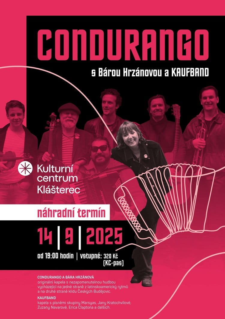Kapela Condurango s herečkou a zpěvačkou Bárou Hrzánovou přináší originální hudbu inspirovanou latinskoamerickými rytmy i českobudějovickou atmosférou. Večer doplní skupina Kaufband, která zahraje písně legend jako Marsyas, Jana Kratochvílová, Zuzana Navarová, Eric Clapton a dalších.