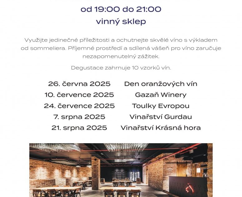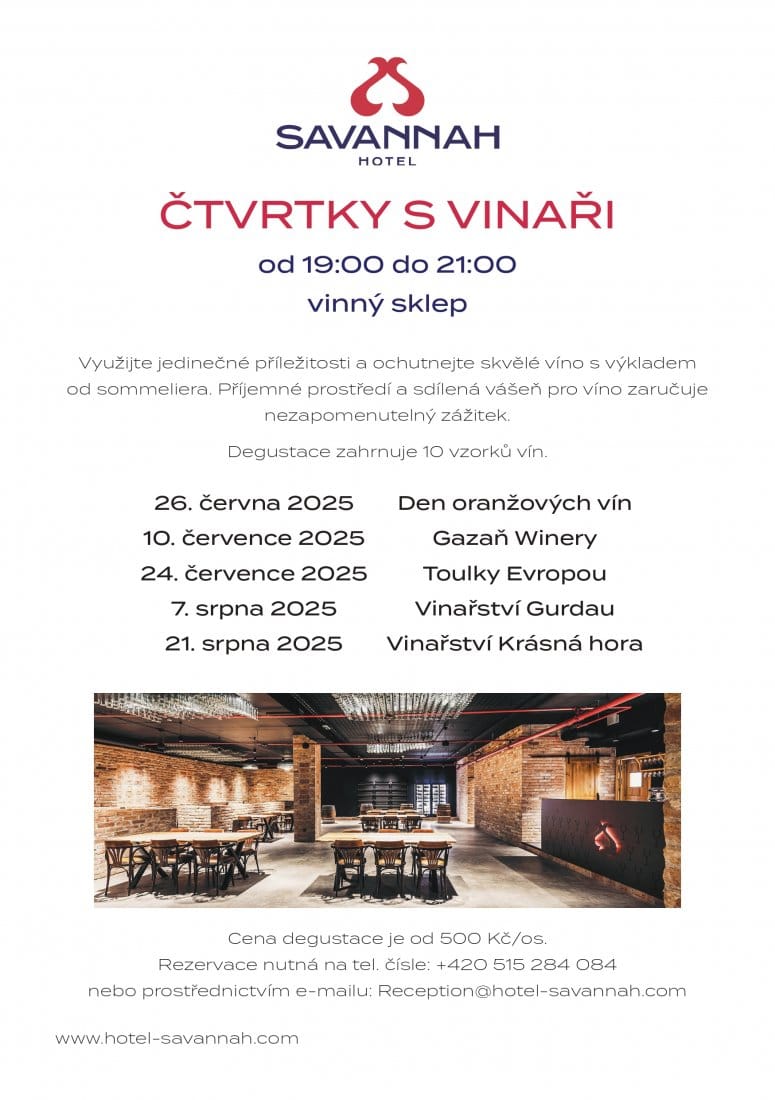 Hotel SAVANNAH zve na letní čtvrteční setkání s vinaři, kdy vám someliér postupně představí nejrůznější vína i vinařská témata. Během večerní degustace v novém moderním vinném sklepě Hotelu SAVANNAH ochutnáte 10 vybraných vzorků vín domácích i zahraničních a připraveno bude i drobné občerstvení k zakousnutí. Pro větší komfort se účastníkům akce nabízí také doprava do/ze Znojma zdarma.