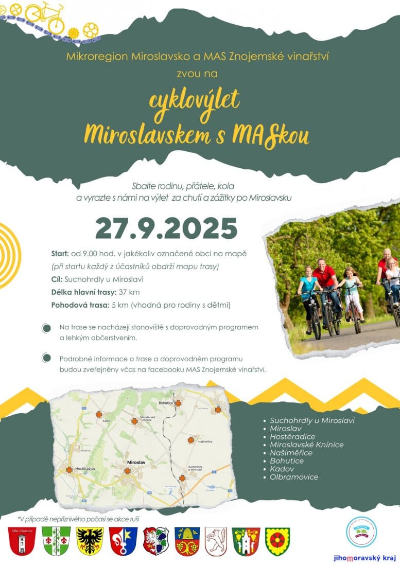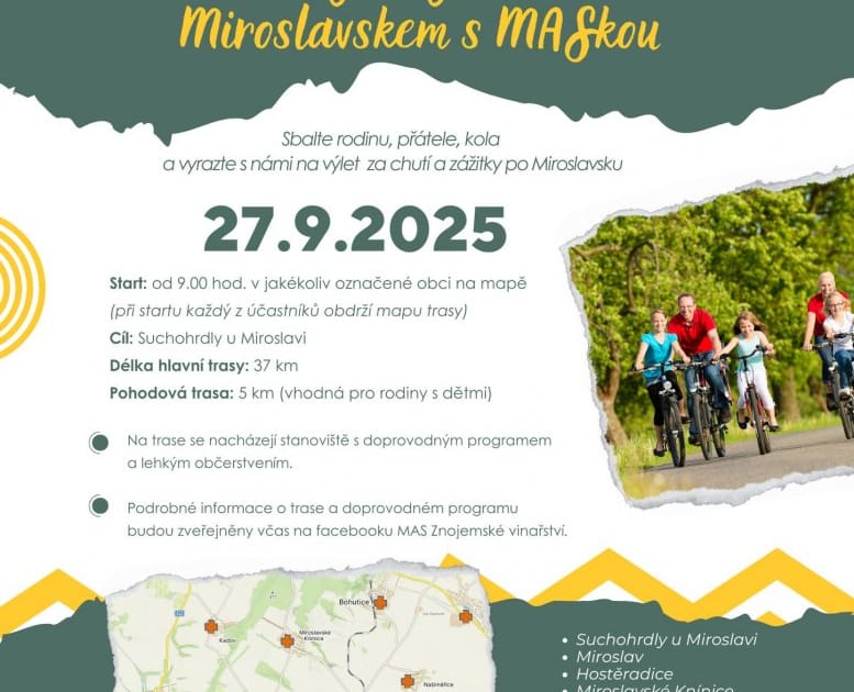 Podzimní cyklovýlet napříč mikroregionem Miroslavska startuje již v 9 hod. Výlet je vhodný pro širokou veřejnost i rodiny s dětmi. Trasa vede přes 8 zapojených obcí a v každé z nich na vás bude čekat stanoviště s úkoly, mapa i kartička pro získání razítka z jednotlivých míst. Cílová obec Suchohrdly u Miroslavi pak připravila i doprovodný program pro všechny účastníky cyklovýletu. Zapojenými obcemi jsou: Suchohrdly u Miroslavi, Hostěradice, Miroslavské Knínice, Našiměřice, Bohutice, Kadov, Olbramovice a také město Miroslav. Během trasy je v každé zapojené obci zajištěno také občerstvení.
