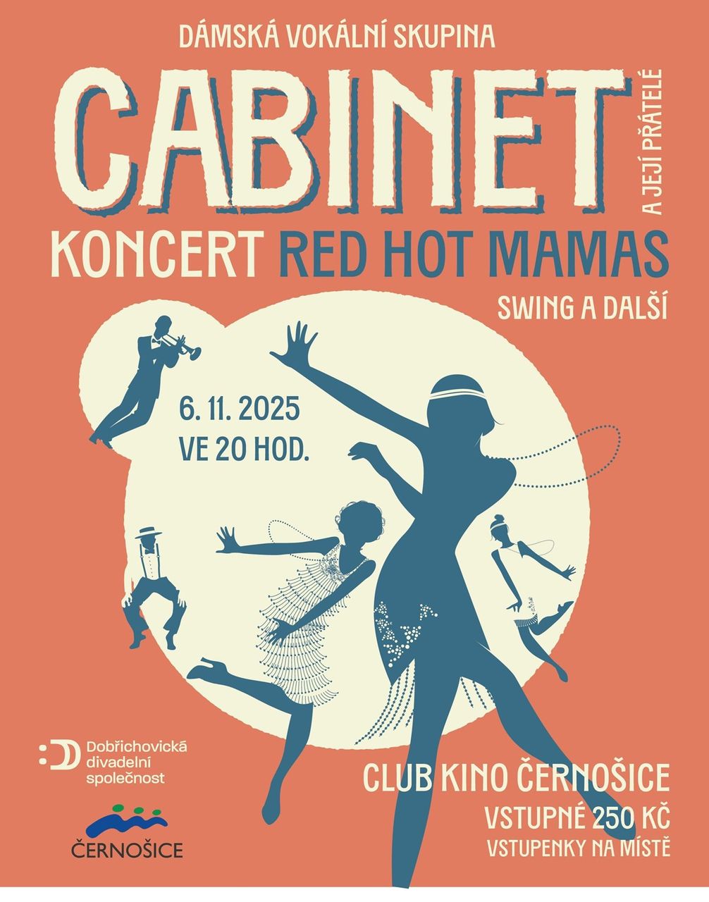 Na večer v rytmu swingu, písní divadla Semafor i legendárního Jaroslava Ježka se můžete těšit ve čtvrtek 6. listopadu. V černošickém Club Kině se s nimi od 20 hodin představí dámská vokální skupina Cabinet. Zatímco před rokem se představila na slavnostním večeru na počest senátorky Františky Plamínkové, tentokrát přijede se svým koncertem nazvaným Red Hot Mamas. Dámy si přizvaly i své muzikantské kamarády – pianistu Luďka Havla, flétnistu Dušana Navaříka, trumpetistu Sašu Skutila, basistu Václava Kašpara a saxofonistu Vítka Němečka. Takže se máte na co těšit.