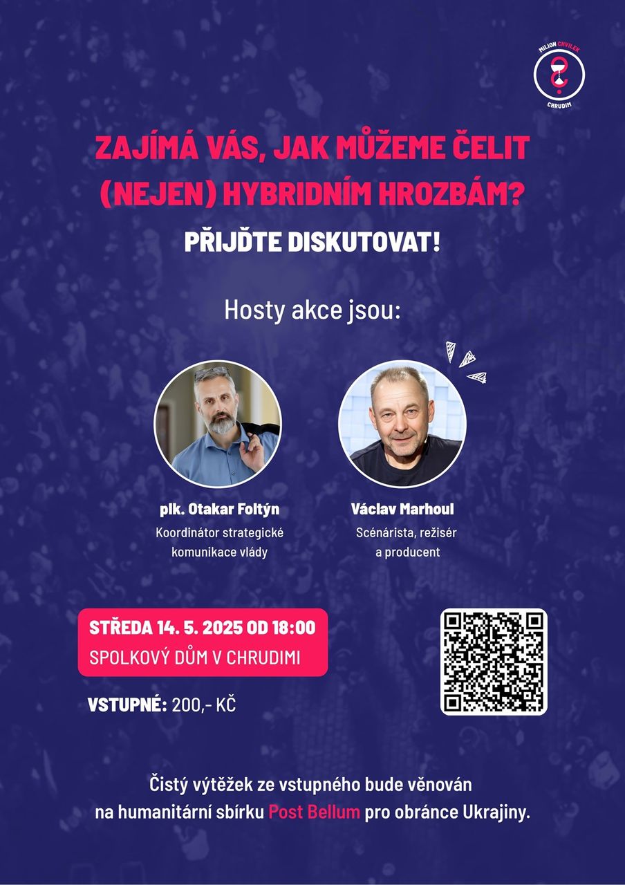 Přijďte se potkat a diskutovat s ředitelem odboru strategické komunikace Úřadu vlády plukovníkem Otakarem Foltýnem a režisérem a producentem Václavem Marhoulem.