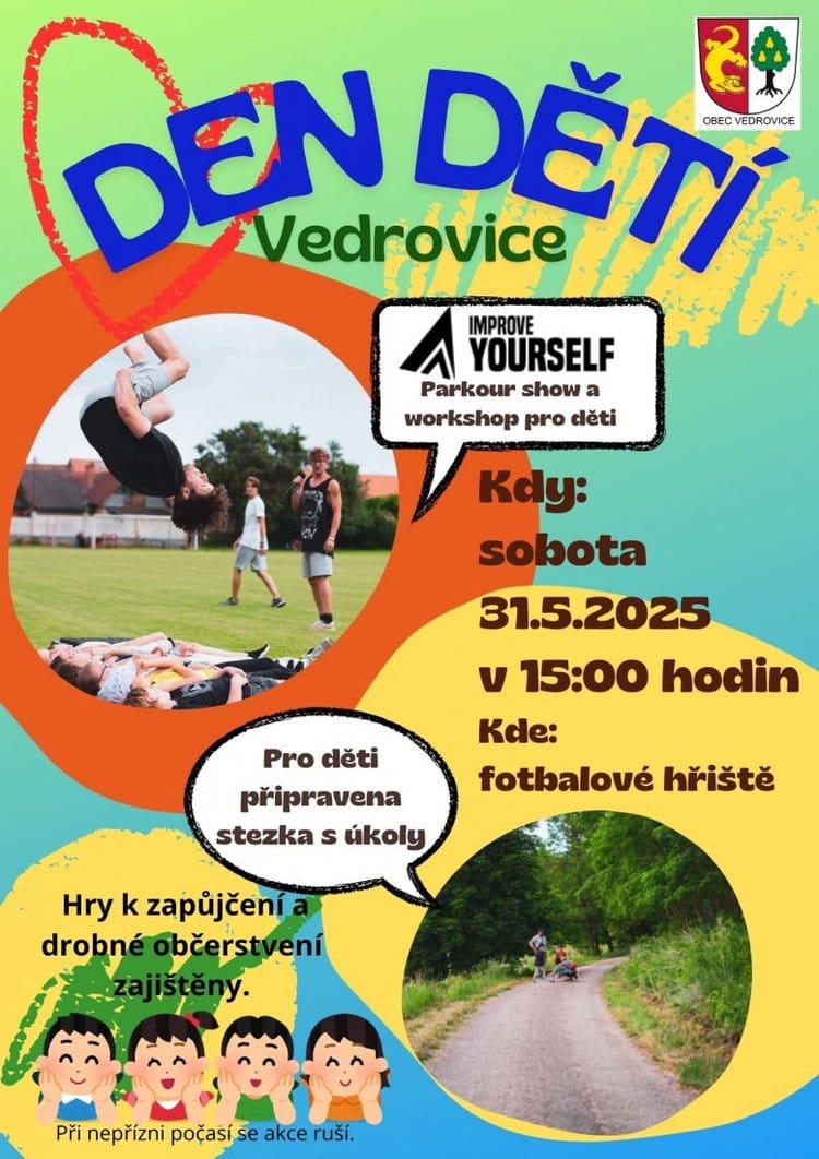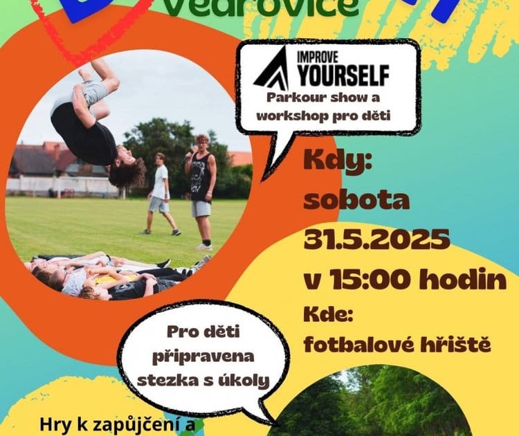 Fotbalové hřiště ve Vedrovicích bude poslední květnovou sobotu hostit program určený zejména dětem. Připravena bude stezka s úkoly, parkurová show i hry k zapůjčení. Začíná se v 15 hod.