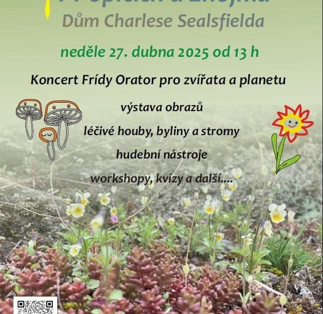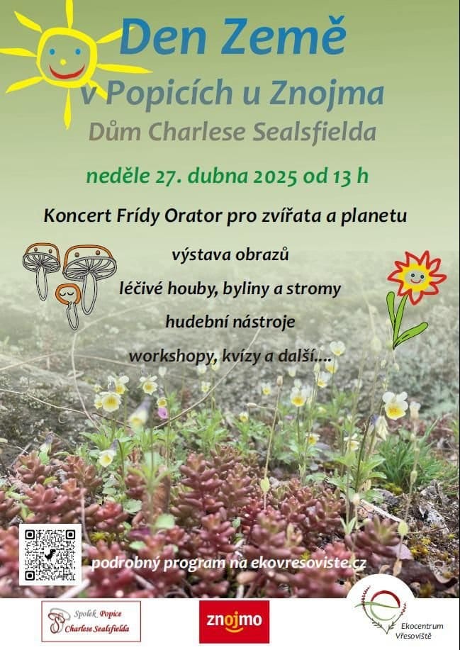 Na rozmanitý program k oslavám mezinárodního Dne Země zvou v neděli 27.dubna i Popice u Znojma. Návštěvníci se mohou těšit na program pro malé i velké. Akce se koná v Rodném domě Charlese Sealsfielda od 13. hodin. V průběhu odpoledne na Vás čeká koncert zpěvačky Frídy Orátor, která své pěvecké vystoupení doprovází na cimbál, zajímavé workshopy a semináře s tématikou léčivých bylin, hub a stromů, stejně jako doprovodná výstava obrazů. Pro děti budou přichystány řemeslné dílničky, kvízy i malování s tématikou přírody. Pro účastníky bude nachystáno i občerstvení.