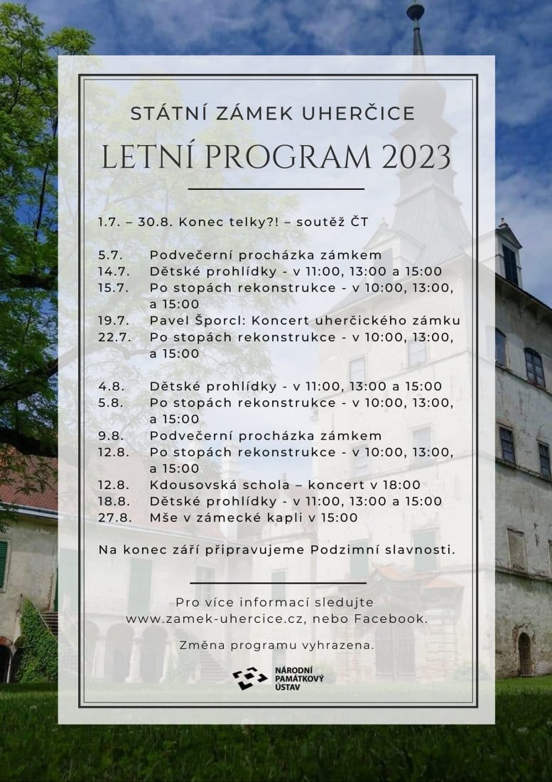 Speciální prázdninové prohlídky určené zejména rodinám s dětmi nabízí nově od letošního roku na zámku Uherčice. Děti si projdou zámek s princeznou, poznají, jak se žilo na šlechtickém sídle, a budou plnit hravé úkoly. Prohlídky jsou zkrácené na 25 min. a začínají v 11:00; 13:00 a 15:00 hod. Jsou vhodné pro děti od 5 do 10 let. Rodiče mohou mezi tím navštívit např. zámecké zahrady a park nebo zámecký lihovar a prohlédnout si tuto technickou památku. Vstupenky je vhodné zakoupit předem on-line.