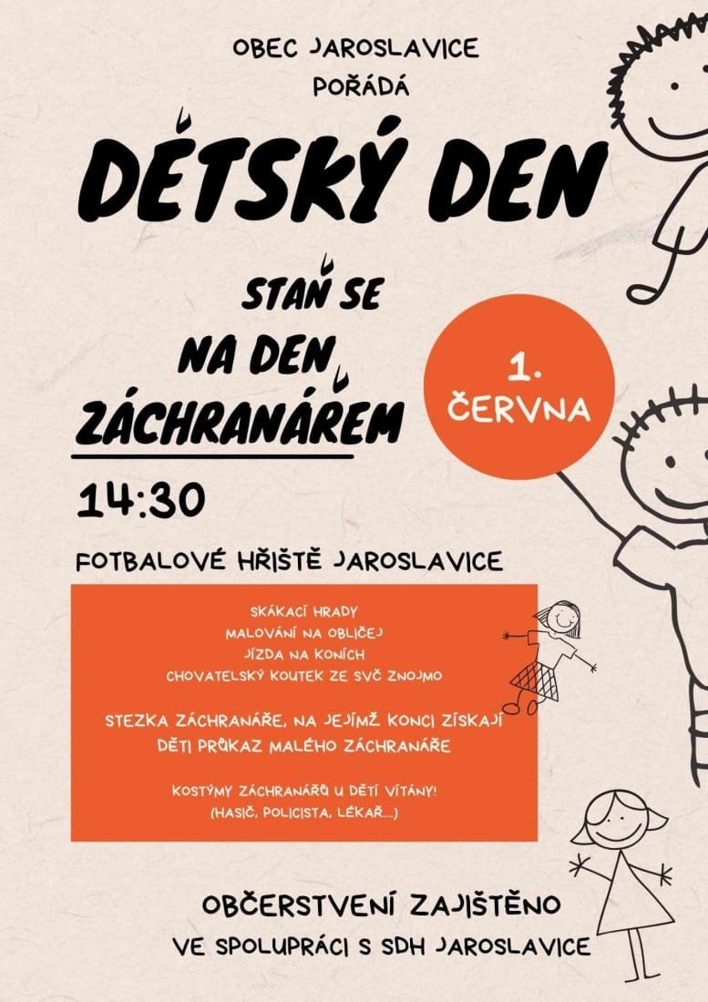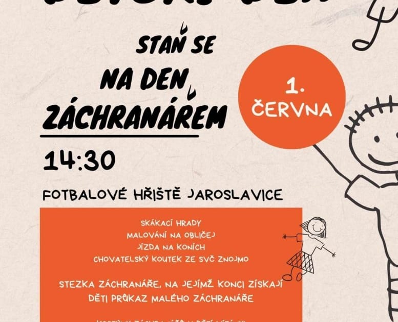 Na oslavy Mezinárodního dne dětí se můžete vypravit i do obce Jaroslavice. První červnovou neděli zde bude pro děti připraven bohatý program v podobě skákacích atrakcí, jízdy na koních, malování na obličej či chovatelský koutek. Pro zájemce bude připravena i záchranářská stezka na jejímž konci děti obdrží PRŮKAZ MALÉHO ZÁCHRANÁŘE. Program se bude konat na fotbalovém hřišti od 14.30 hod. a během celého odpoledne bude zajištěno také občerstvení. Děti v kostýmech záchranářů vítány!