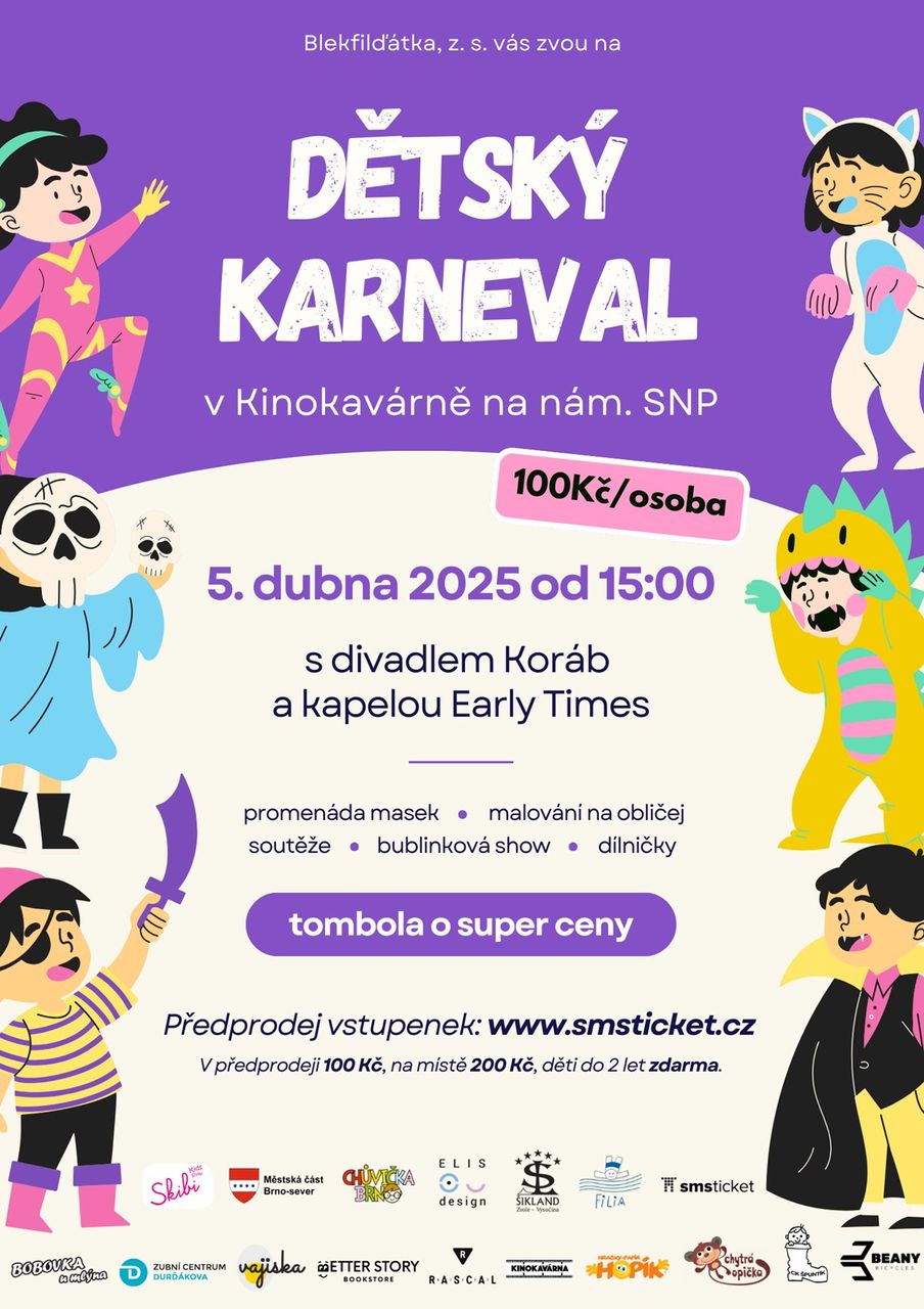 Spolek Blekfilďátka, z. s. vás srdečně zve na dětský karneval, který se bude konat 5. dubna 2025 od 15:00 ve velkém sále Kinokávarny na nám. SNP v Brně-Černých Polích (otevřeno bude již od 14:30, v 15:00 bude zahájení).