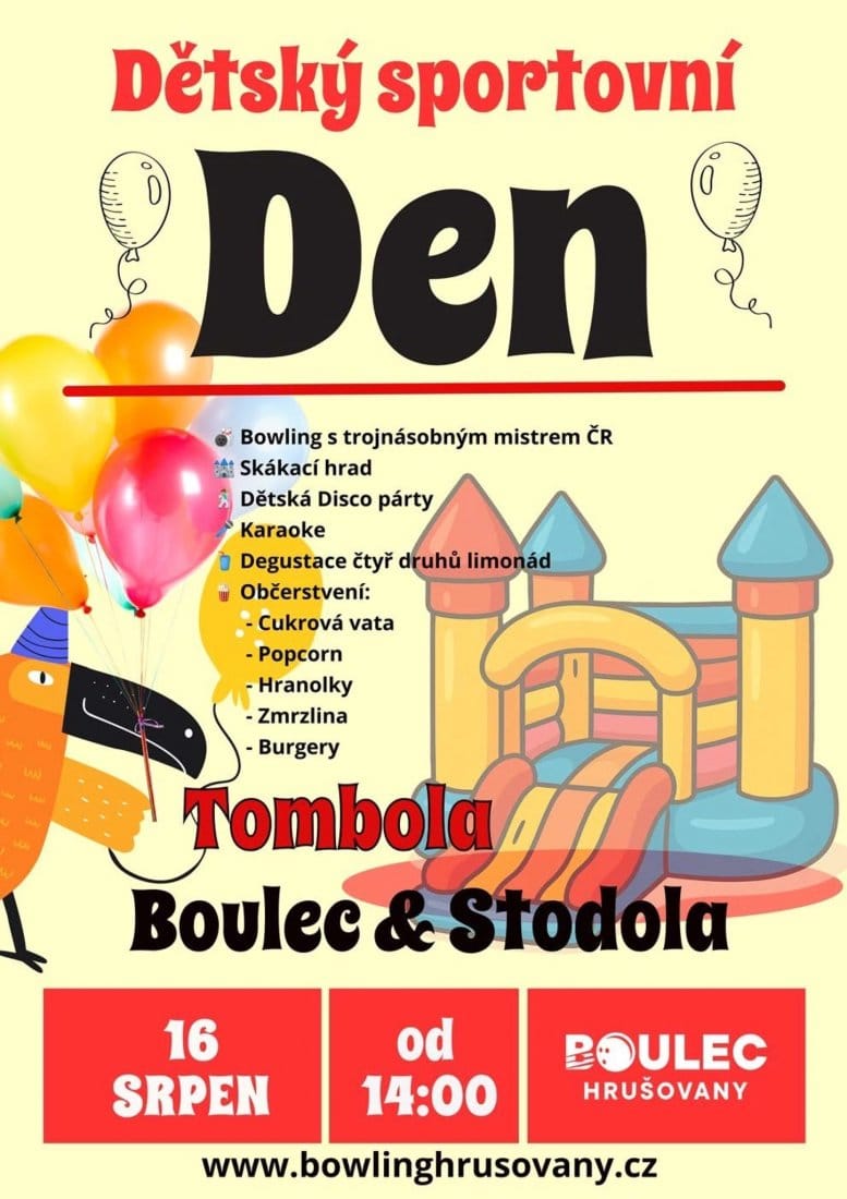 Přijít si užít bohatý sportovní program můžete s dětmi do Hrušovan nad Jevišovkou. Od 14 hod. bude možnost zahrát si bowling s trojnásobným mistrem ČR anebo se vyřádit na skákacích atrakcích. Další program slibuje dětskou diskotéku, karaoke show, degustační odpoledne plné limonád a k dispozici bude také pestré občerstvení. Na dětské účastníky čeká také bohatá tombola.