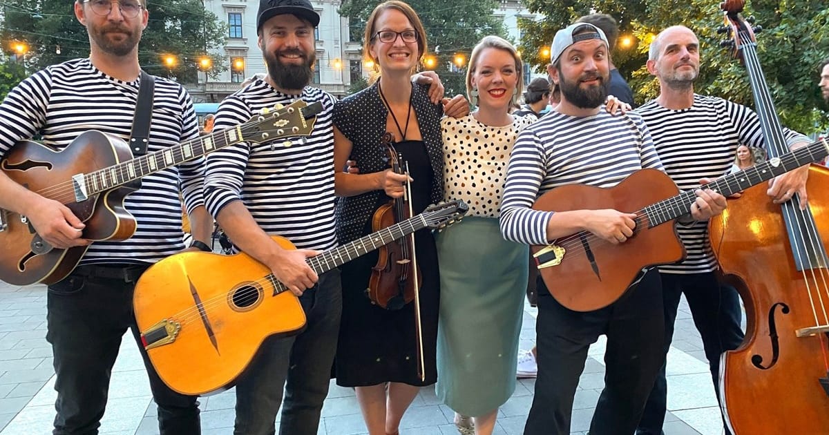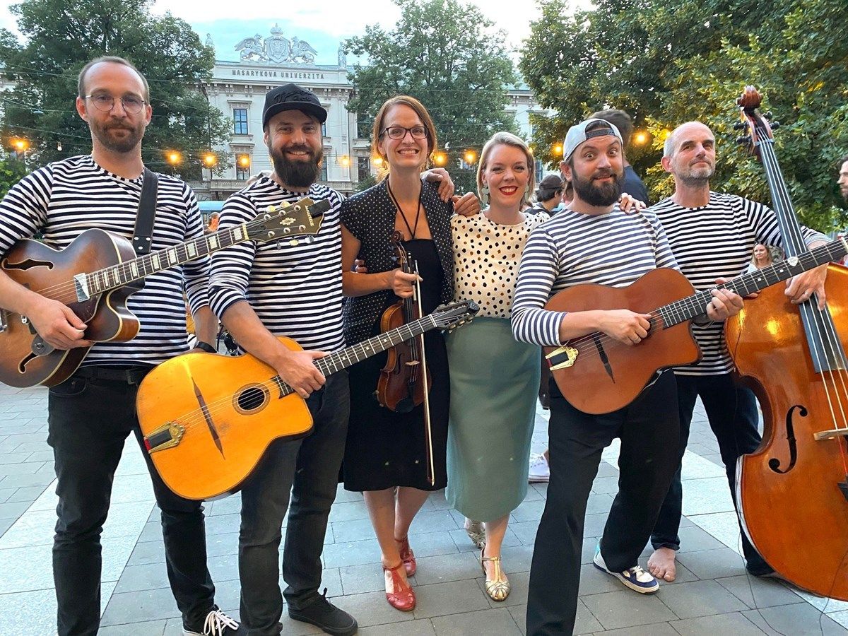 Django Jet je projekt, který před 11-ti lety založila skupina brněnských milovníků swingu a swingového tance. Dnes se kapela hudebně zaměřuje převážně na český a francouzský swing, hlavní zpěvačka Marie Gilbert se narodila v Belgii a její sametový hlas vám učaruje ať už v jejím podání vyslechnete Slunečnici nebo La vie en rose. Kromě zpívaných písní obohacují repertoár i instrumentální gypsy swingové skladby po vzoru francouzské kytarové legendy Django Reinhardta a nově i originální kompozice kytaristy Luky Cojhtera.