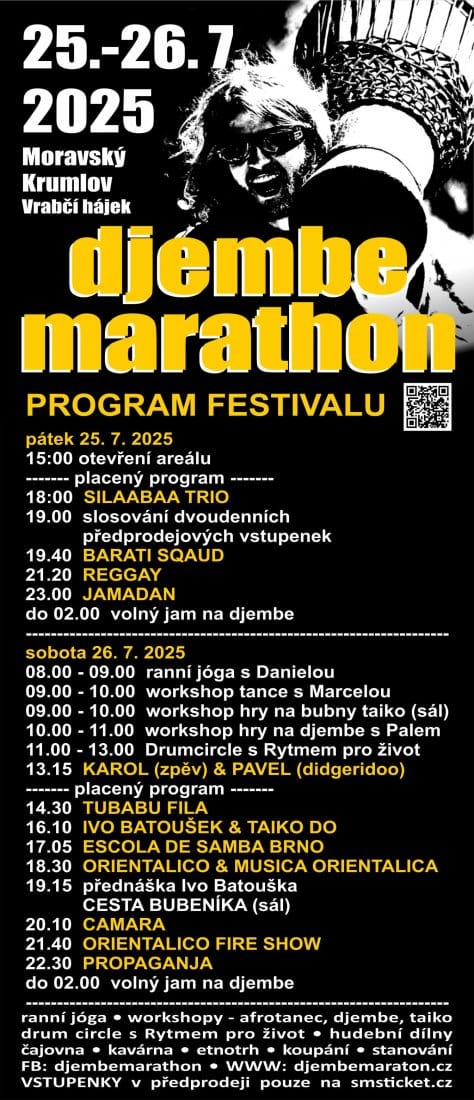 World Music & Dance Festival, africká hudba a všelijaké bubnování zaplní i letos na konci července přírodní areál Vrabčí hájek v Moravském Krumlově. Kromě hudby na Vás čekají i dynamické workshopy zaměřené na hudbu i tanec, stejně jako ranní jóga. Festival je letos zaměřen také na japonské bubny a dále na brazilské a balkánské rytmy.