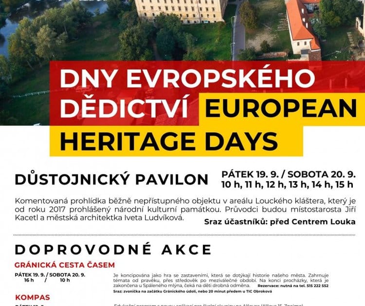 – KOMENTOVANÉ PROHLÍDKY DŮSTOJNICKÉHO PAVILONU proběhnou v pátek 19. září v 10 hod. a v 15 hod. a také v sobotu 20. září ve stejných časech: v 10 hod. a v 15 hod. Průvodci budou historik Jiří Kacetl a městská architektka Iveta Ludvíková. Sraz účastníků je před centrem Louka.