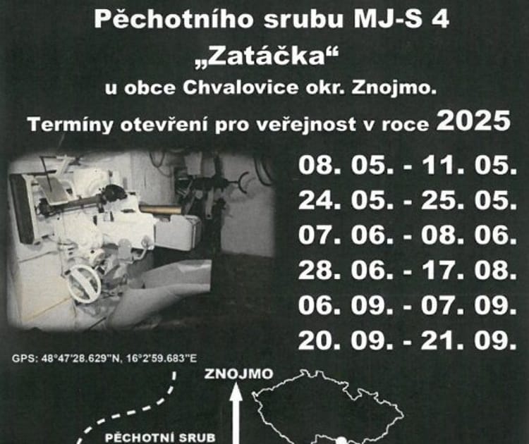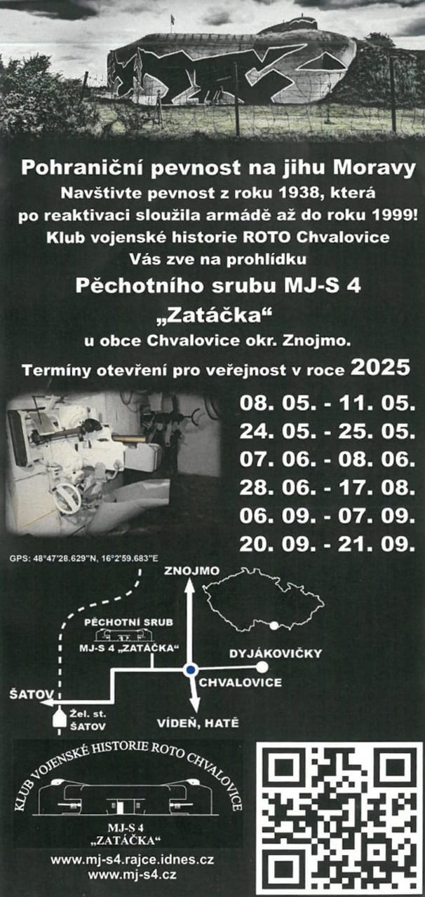 Pěchotní srub MJ-S 4 s krycím jménem „Zatáčka“ ve Chvalovicích se pravidelně každé léto otevírá veřejnosti a nabízí možnost prohlédnout si vojenskou pevnost z roku 1938, která po reaktivaci sloužila armádě až do roku 1999. Na první srpnovou neděli zde připravil Klub vojenské historie ROTO Chvalovice, který srub spravuje, menší akci pro veřejnost. Ve spolupráci s Klubem vojenské historie Slovácko připravil malou venkovní expozici věnovanou výstroji a výzbroji prvorepublikové armády, krátké ukázky dobového výcviku a představení hlavních pěchotních zbraní předválečné armády. Návštěvníci se tak mají možnost od 10 do 15 hod. seznámit se službou prvorepublikové armády s poutavým výkladem členů vojenskohistorických klubů. Přijďte se na vlastní oči seznámit s historií pohraničního opevnění i s životem vojáků v době jejich aktivní služby. V případě nepřízně počasí bude venkovní expozice omezena.