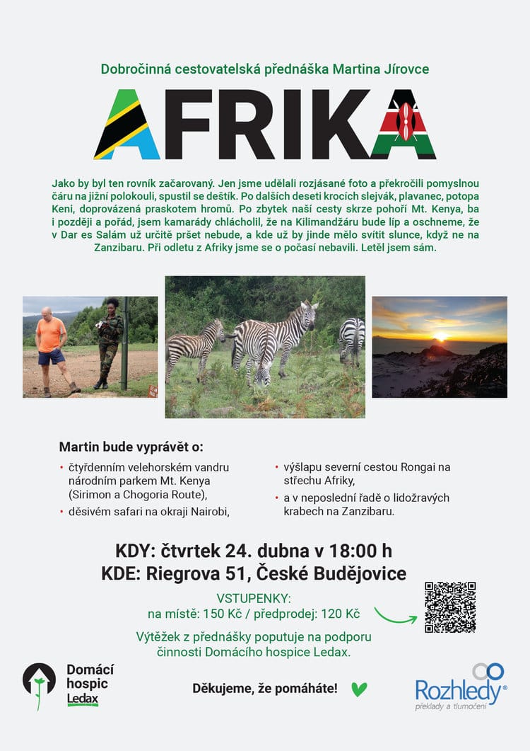 Druhá letošní dobročinná cestovatelská přednáška na podporu Domácího hospice Ledax vás vezme do Afriky. Přednášet bude tradičně Martin Jírovec, který bude vyprávět o cestě, na kterou vyrazil s trojicí přátel.