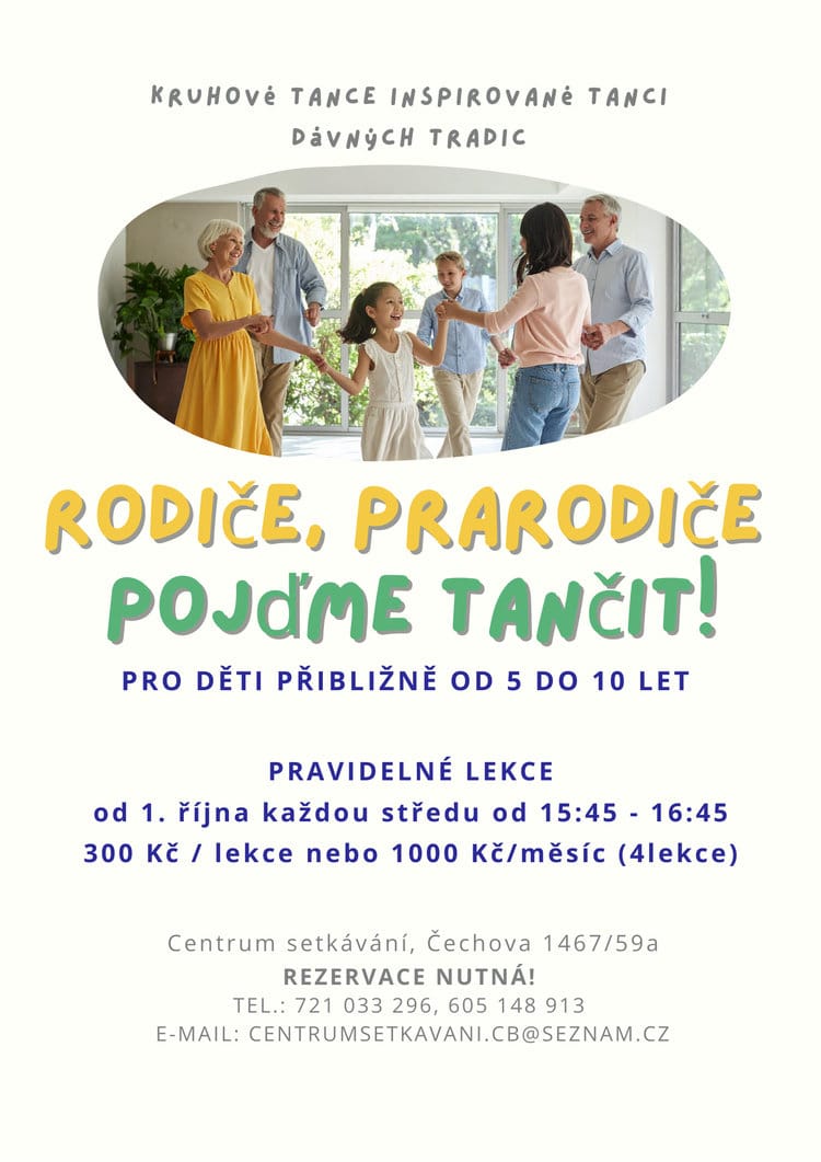 Vážení rodiče a prarodiče, chcete se svými dětmi a vnuky prožít příjemné chvíle při společné aktivitě? Pak máte možnost si spolu zatančit kruhové tance, inspirované „Tanci dávných tradic“. Pro děti od 5 do 10 let.