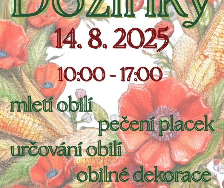 „Prázdniny se pomalu, ale jistě blíží ke svému závěru. Pokud se nudíte nebo nevíte, co podniknout, přijďte s dětmi vyzkoušet mletí obilí na pravěkých kamenných žernovech, upéct placky na ohni, naučit se rozeznávat jednotlivé druhy obilí, vytvořit si obilné dekorace a zabavit se tvořením v našich dožínkových dílničkách. Dozvíte se, co to jsou Dožínky, kdy se slaví a jaké tradice se s nimi pojí. Akce je určena pro všechny věkové kategorie a každý se u nás přijde na své“, pozvala za muzeum Jitka Krouzová.