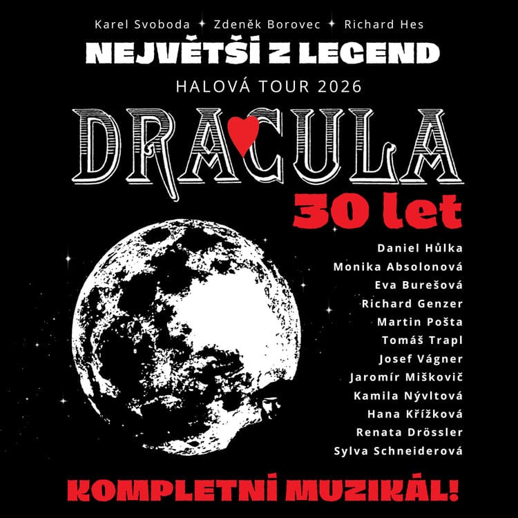 Muzikálová legenda Dracula slaví 30 let od své premiéry a při této příležitosti přináší speciální výroční turné po velkých halách. Navazuje tak na úspěšná halová uvedení ze zimy 2025, tentokrát však v ještě velkolepějším provedení. Diváci se mohou těšit nejen na Daniela Hůlku v titulní roli hraběte Draculy, ale i na Moniku Absolonovou, Evu Burešovou, Richarda Genzera, Josefa Vágnera a další.